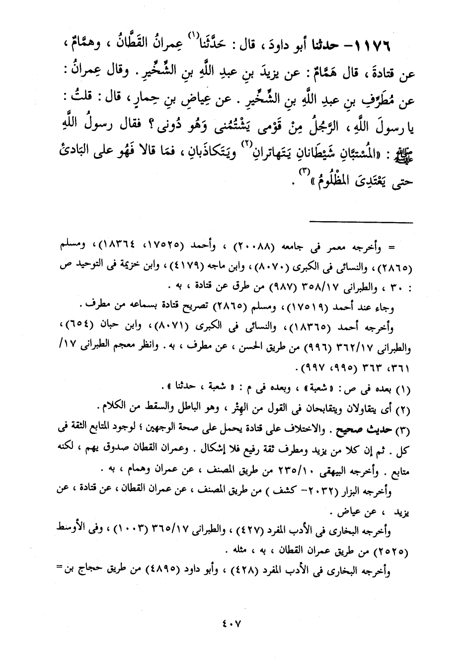 1176 - حَدَّثَنَا أَبُو دَاوُدَ قَالَ: حَدَّثَنَا عِمْرَانُ الْقَطَّانُ، وَهَمَّامٌ، عَنْ قَتَادَةَ، قَالَ هَمَّامٌ: عَنْ يَزِيدَ بْنِ عَبْدِ اللَّهِ بْنِ الشِّخِّيرِ، وَقَالَ، عِمْرَانُ: عَنْ مُطَرِّفِ بْنِ عَبْدِ اللَّهِ بْنِ الشِّخِّيرِ، عَنْ عِيَاضِ بْنِ حِمَارٍ، قَالَ: قُلْتُ: يَا رَسُولَ اللَّهِ، الرَّجُلُ مِنْ قَوْمِي يَشْتُمُنِي وَهُوَ دُونِي؟ فَقَالَ رَسُولُ اللَّهِ صَلَّى اللهُ عَلَيْهِ وَسَلَّمَ: «§الْمُسْتَبَّانِ شَيْطَانَانِ يَتَهَاتَرَانِ وَيَتَكَاذَبَانِ، فَمَا قَالَا فَهُوَ عَلَى الْبَادِئِ حَتَّى يَعْتَدِيَ الْمَظْلُومُ»