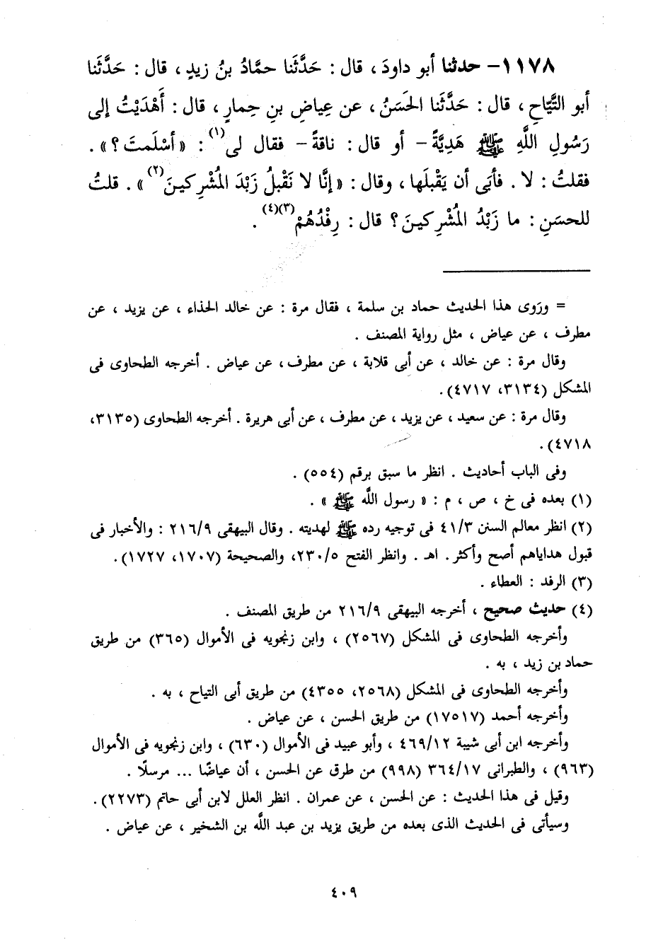 1178 - حَدَّثَنَا أَبُو دَاوُدَ قَالَ: حَدَّثَنَا حَمَّادُ بْنُ زَيْدٍ، قَالَ: حَدَّثَنَا أَبُو التَّيَّاحِ، قَالَ: حَدَّثَنَا الْحَسَنُ، عَنْ عِيَاضِ بْنِ حِمَارٍ، قَالَ: أَهْدَيْتُ إِلَى رَسُولِ اللَّهِ صَلَّى اللهُ عَلَيْهِ وَسَلَّمَ هَدِيَّةً أَوْ قَالَ: نَاقَةً فَقَالَ لِي: «أَسْلَمْتَ؟» فَقُلْتُ: لَا فَأَبَى أَنْ يَقْبَلَهَا، وَقَالَ: «إِنَّا §لَا نَقْبَلُ زَبْدَ الْمُشْرِكِينَ» قُلْتُ لِلْحَسَنِ مَا زَبْدُ الْمُشْرِكِينَ؟ قَالَ: رِفْدُهُمْ