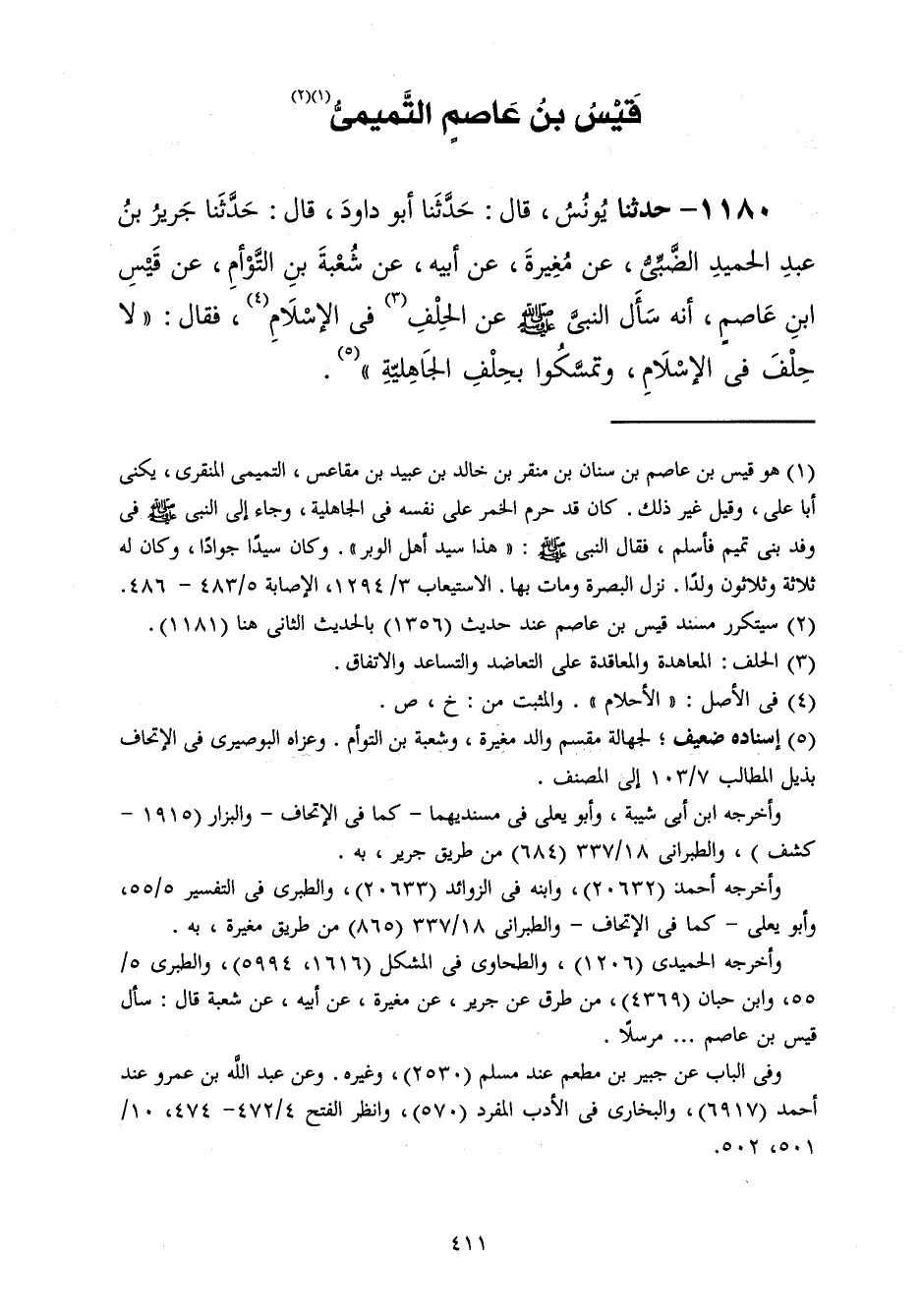 1180 - حَدَّثَنَا يُونُسُ قَالَ: حَدَّثَنَا أَبُو دَاوُدَ قَالَ: حَدَّثَنَا جَرِيرُ بْنُ عَبْدِ الْحَمِيدِ الضَّبِّيُّ، عَنْ مُغِيرَةَ، عَنْ أَبِيهِ، عَنْ شُعْبَةَ بْنِ التَّوْءَمِ، عَنْ قَيْسِ بْنِ عَاصِمٍ، أَنَّهُ سَأَلَ النَّبِيَّ صَلَّى اللهُ عَلَيْهِ وَسَلَّمَ عَنِ الْحِلْفِ فِي الْإِسْلَامِ فَقَالَ: «§لَا حِلْفَ فِي الْإِسْلَامِ وَتَمَسَّكُوا بِحِلْفِ الْجَاهِلِيَّةِ»
