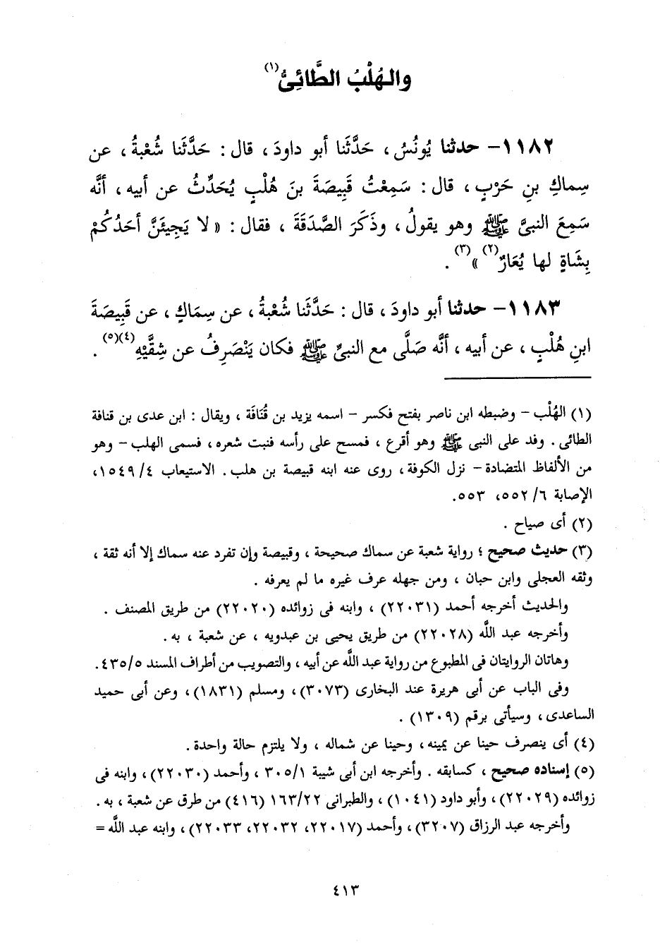 1182 - حَدَّثَنَا يُونُسُ، حَدَّثَنَا أَبُو دَاوُدَ قَالَ: حَدَّثَنَا شُعْبَةُ، عَنْ سِمَاكِ بْنِ حَرْبٍ، قَالَ: سَمِعْتُ قَبِيصَةَ بْنَ هُلْبٍ، يُحَدِّثُ عَنْ أَبِيهِ، أَنَّهُ سَمِعَ النَّبِيَّ صَلَّى اللهُ عَلَيْهِ وَسَلَّمَ وَهُوَ يَقُولُ وَذَكَرَ الصَّدَقَةَ فَقَالَ: «§لَا يَجِيئَنَّ أَحَدُكُمْ بِشَاةٍ لَهَا يُعَارٌ»