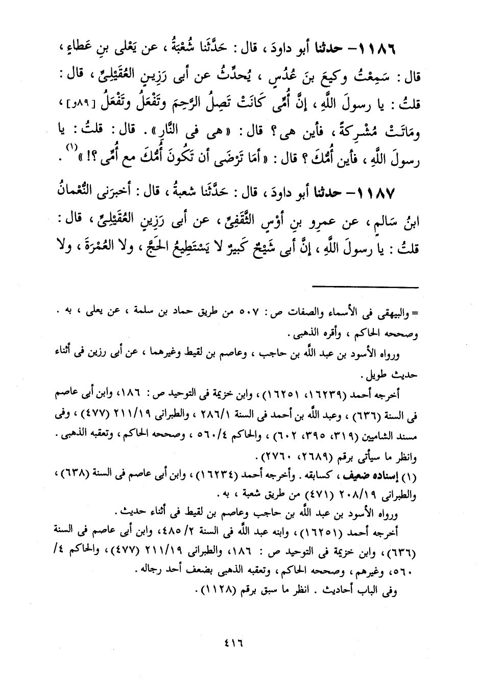 1186 - حَدَّثَنَا أَبُو دَاوُدَ قَالَ: حَدَّثَنَا شُعْبَةُ، عَنْ يَعْلَى بْنِ عَطَاءٍ، قَالَ: سَمِعْتُ وَكِيعَ بْنَ عُدُسٍ، يُحَدِّثُ عَنْ أَبِي رَزِينٍ الْعُقَيْلِيِّ، قَالَ: قُلْتُ: يَا رَسُولَ اللَّهِ، إِنَّ §أُمِّي كَانَتْ تَصِلُ الرَّحِمَ وَتَفْعَلُ وَتَفْعَلُ وَمَاتَتْ مُشْرِكَةً فَأَيْنَ هِيَ؟ قَالَ: «هِيَ فِي النَّارِ» قَالَ: قُلْتُ يَا رَسُولَ اللَّهِ، فَأَيْنَ أُمُّكَ؟ قَالَ: «أَمَا تَرْضَى أَنْ تَكُونَ أُمُّكَ مَعَ أُمِّي»