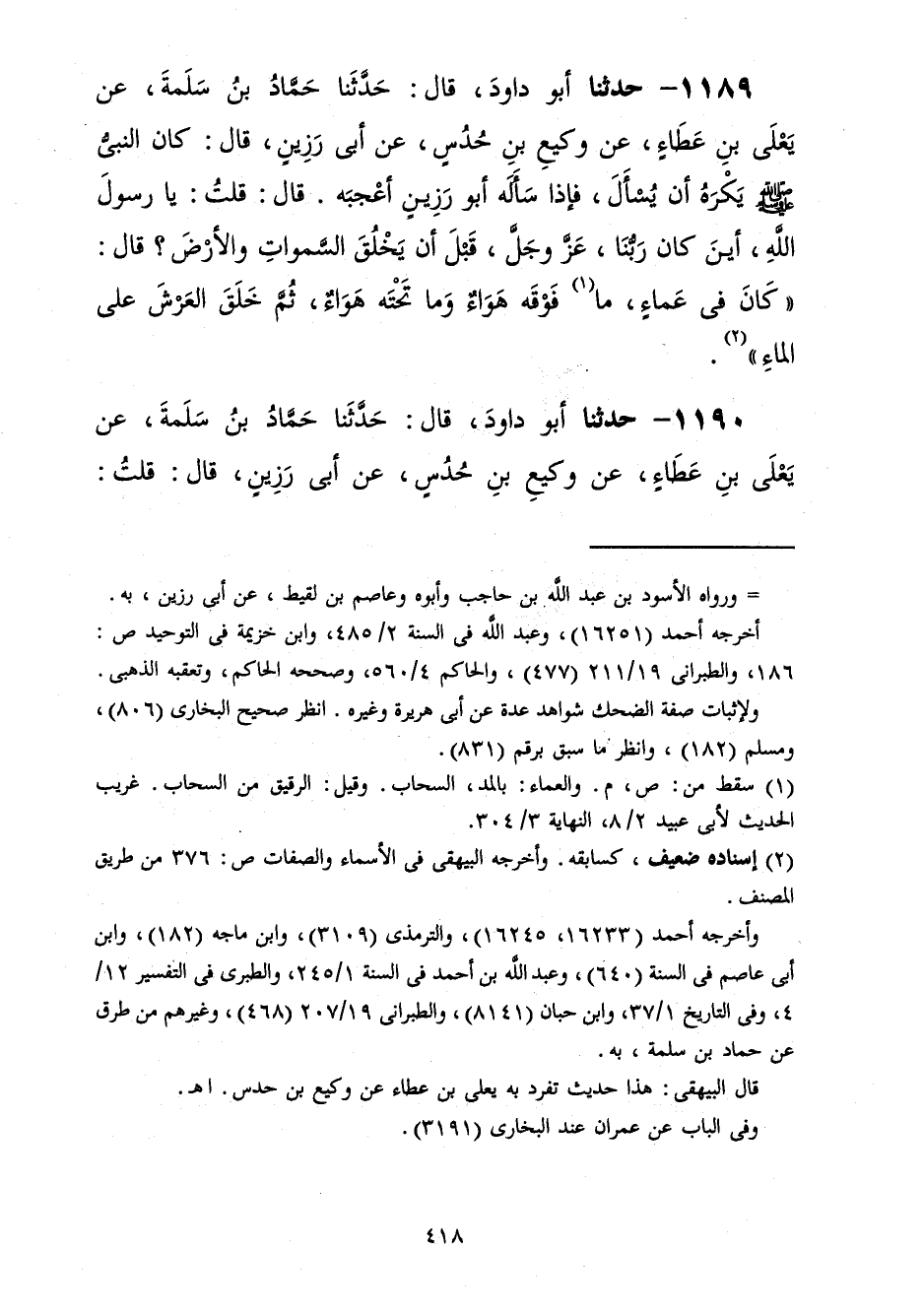 1189 - حَدَّثَنَا أَبُو دَاوُدَ قَالَ: حَدَّثَنَا حَمَّادُ بْنُ سَلَمَةَ، عَنْ يَعْلَى بْنِ عَطَاءٍ، عَنْ وَكِيعِ بْنِ حُدُسٍ، عَنْ أَبِي رَزِينٍ، قَالَ: كَانَ النَّبِيُّ صَلَّى اللهُ عَلَيْهِ وَسَلَّمَ يَكْرَهُ أَنْ يُسْأَلَ فَإِذَا سَأَلَهُ أَبُو رَزِينٍ أَعْجَبَهُ قَالَ: قُلْتُ: يَا رَسُولَ اللَّهِ، §أَيْنَ كَانَ رَبُّنَا عَزَّ وَجَلَّ قَبْلَ أَنْ يَخْلُقَ السَّمَوَاتِ وَالْأَرْضَ؟ قَالَ: «كَانَ فِي عَمَاءٍ مَا فَوْقَهُ هَوَاءٌ، وَمَا تَحْتَهُ هَوَاءٌ ثُمَّ خَلَقَ الْعَرْشَ عَلَى الْمَاءِ»
