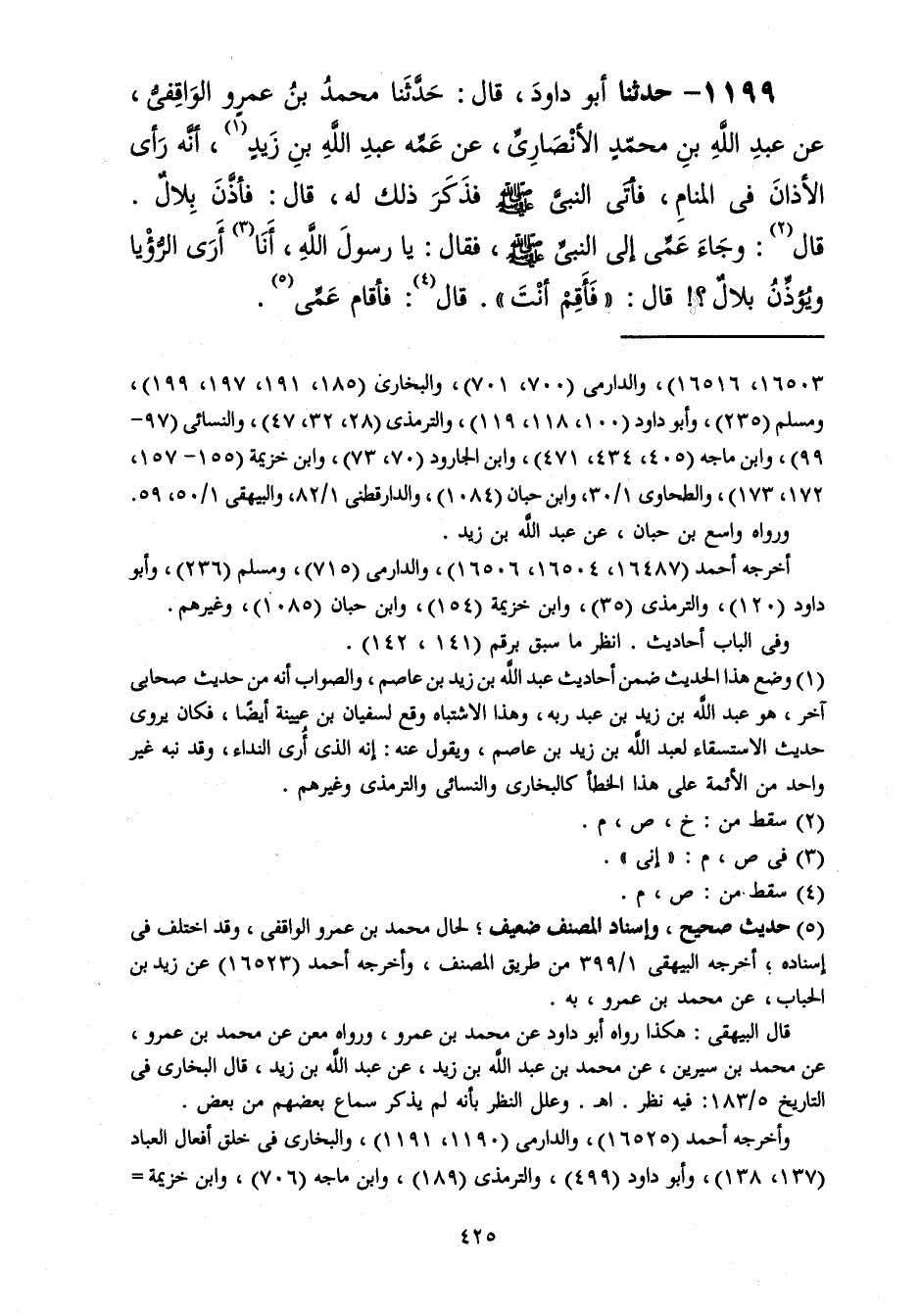 1199 - حَدَّثَنَا أَبُو دَاوُدَ قَالَ: حَدَّثَنَا مُحَمَّدُ بْنُ عَمْرٍو الْوَاقِفِيُّ، عَنْ عَبْدِ اللَّهِ بْنِ مُحَمَّدٍ الْأَنْصَارِيِّ، عَنْ عَمِّهِ عَبْدِ اللَّهِ بْنِ زَيْدٍ، أَنَّهُ §رَأَى الْأَذَانَ فِي الْمَنَامِ فَأَتَى النَّبِيَّ صَلَّى اللهُ عَلَيْهِ وَسَلَّمَ فَذَكَرَ ذَلِكَ لَهُ قَالَ: فَأَذَّنَ بِلَالٌ قَالَ: وَجَاءَ عَمِّي إِلَى النَّبِيِّ صَلَّى اللهُ عَلَيْهِ وَسَلَّمَ فَقَالَ: يَا رَسُولَ اللَّهِ، " أَنَا أَرَى الرُّؤْيَا وَيُؤَذِّنُ بِلَالٌ قَالَ: «فَأَقِمْ أَنْتَ» قَالَ: فَأَقَامَ عَمِّي