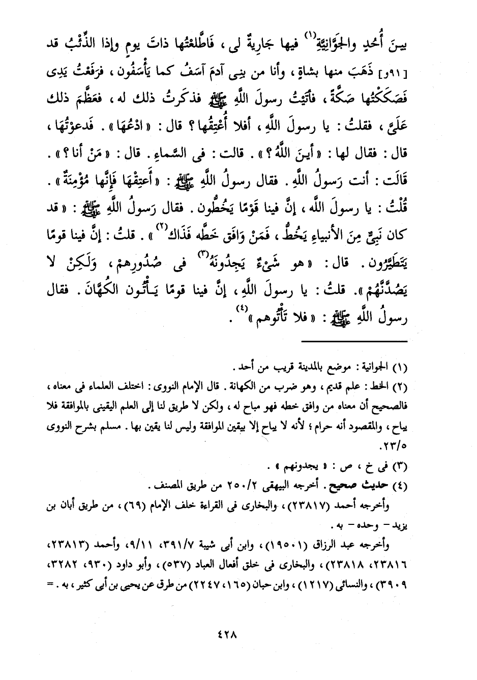 فَاطَّلَعْتُهَا ذَاتَ يَوْمٍ وَإِذَا الذِّئْبُ قَدْ ذَهَبَ مِنْهَا بِشَاةٍ وَأَنَا مِنْ بَنِي آدَمَ آسَفُ كَمَا يَأْسَفُونَ، فَرَفَعْتُ يَدِي فَصَكَكْتُهَا صَكَّةً، فَأَتَيْتُ رَسُولَ اللهِ صَلَّى الله عَلَيْهِ وَسَلَّمَ فَذَكَرْتُ ذَلِكَ لَهُ، فَعَظَّمَ ذَلِكَ عَلَيَّ، فَقُلْتُ: يَا رَسُولَ اللهِ، أَفَلاَ أُعْتِقُهَا؟ قَالَ: ادْعُهَا، فَدَعَوْتُهَا، قَالَ: فَقَالَ لَهَا: أَيْنَ اللهُ؟ قَالَتْ: فِي السَّمَاءِ، قَالَ: مَنْ أَنَا؟ قَالَتْ: أَنْتَ رَسُولُ اللهِ، فَقَالَ رَسُولُ اللهِ صَلَّى الله عَلَيْهِ وَسَلَّمَ: أَعْتِقْهَا فَإِنَّهَا مُؤْمِنَةٌ، قُلْتُ: يَا رَسُولَ اللهِ، إِنَّ فِينَا قَوْمًا يَخُطُّونَ فَقَالَ رَسُولُ اللهِ صَلَّى الله عَلَيْهِ وَسَلَّمَ: قَدْ كَانَ نَبِيٌّ مِنَ الأَنْبِيَاءِ يَخُطُّ فَمَنْ وَافَقَ خَطَّهُ فَذَاكَ، قُلْتُ: إِنَّ فِينَا قَوْمًا يَتَطَيَّرُونَ، قَالَ: هُوَ شَيْءٌ يَجِدُونَهُ فِي صُدُورِهِمْ وَلَكِنْ لاَ يَصُدَّنَّهُمُ، قُلْتُ: يَا رَسُولَ اللهِ، إِنَّ فِينَا قَوْمًا يَأْتُونَ الْكُهَّانَ، فَقَالَ رَسُولُ اللهِ صَلَّى الله عَلَيْهِ وَسَلَّمَ: فَلاَ تَأْتُوهُمْ.