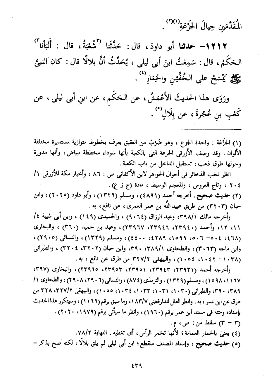 1212 - حَدَّثَنَا أَبُو دَاوُدَ قَالَ: حَدَّثَنَا شُعْبَةُ قَالَ: أَنْبَأَنَا الْحَكَمُ، قَالَ: سَمِعْتُ ابْنَ أَبِي لَيْلَى، يُحَدِّثُ أَنَّ بِلَالًا، قَالَ: «كَانَ النَّبِيُّ صَلَّى اللهُ عَلَيْهِ وَسَلَّمَ §يَمْسَحُ عَلَى الْخُفَّيْنِ وَالْخِمَارِ» وَرَوَى هَذَا الْحَدِيثَ الْأَعْمَشُ عَنِ الْحَكَمِ عَنِ ابْنِ أَبِي لَيْلَى عَنْ كَعْبِ بْنِ عُجْرَةَ عَنْ بِلَالٍ