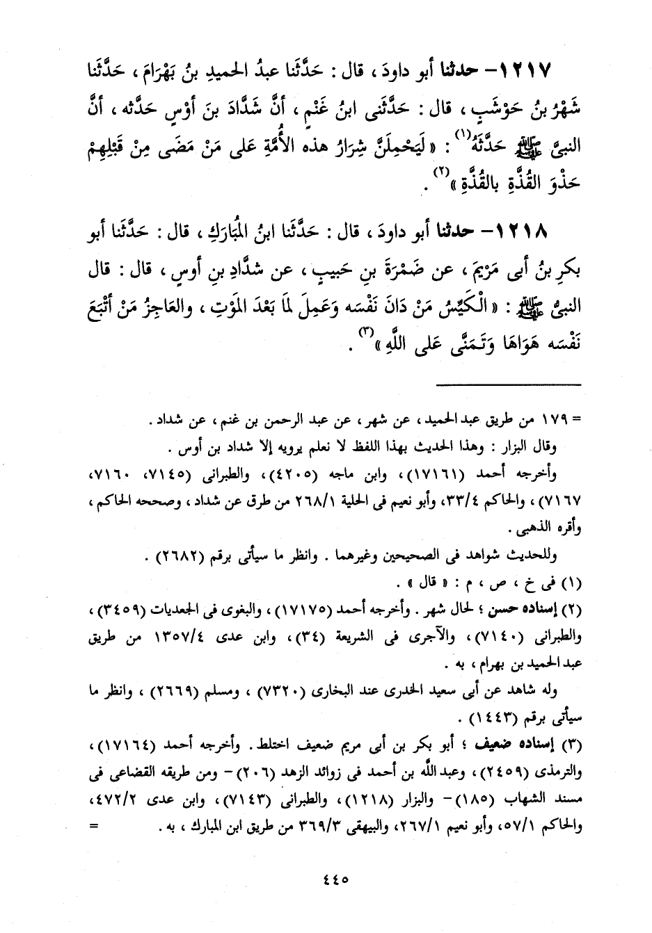 1217 - حَدَّثَنَا أَبُو دَاوُدَ قَالَ: حَدَّثَنَا عَبْدُ الْحَمِيدِ بْنُ بَهْرَامَ، حَدَّثَنَا شَهْرُ بْنُ حَوْشَبٍ، قَالَ: حَدَّثَنِي ابْنُ غَنْمٍ، أَنَّ شَدَّادَ بْنَ أَوْسٍ، حَدَّثَهُ أَنَّ النَّبِيَّ صَلَّى اللهُ عَلَيْهِ وَسَلَّمَ حَدَّثَهُ: «§لَيَحْمِلَنَّ شِرَارُ هَذِهِ الْأُمَّةِ عَلَى مَنْ مَضَى مِنْ قَبْلِهِمْ حَذْوَ الْقُذَّةِ بِالْقُذَّةِ»