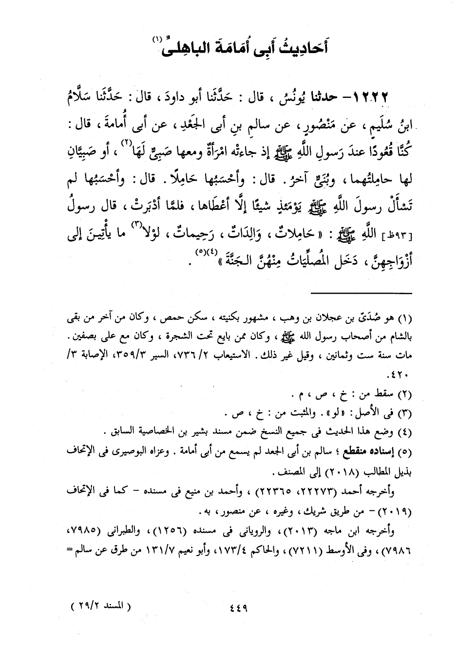 1222 - حَدَّثَنَا يُونُسُ قَالَ: حَدَّثَنَا أَبُو دَاوُدَ قَالَ: حَدَّثَنَا سَلَّامُ بْنُ سُلَيْمٍ، عَنْ مَنْصُورٍ، عَنْ سَالِمِ بْنِ أَبِي الْجَعْدِ، عَنْ أَبِي أُمَامَةَ، قَالَ: كُنَّا قُعُودًا عِنْدَ رَسُولِ اللَّهِ صَلَّى اللهُ عَلَيْهِ وَسَلَّمَ إِذْ جَاءَتْهُ امْرَأَةٌ وَمَعَهَا صَبِيٌّ لَهَا أَوْ صَبِيَّانِ لَهَا حَامِلَتُهُمَا وَبُنَيٌّ آخَرُ قَالَ: وَأَحْسَبُهَا حَامِلًا قَالَ: وَأَحْسَبُهَا لَمْ تَسْأَلْ رَسُولَ اللَّهِ صَلَّى اللهُ عَلَيْهِ وَسَلَّمَ يَوْمَئِذٍ شَيْئًا إِلَّا أَعْطَاهَا فَلَمَّا أَدْبَرَتْ قَالَ رَسُولُ اللَّهِ صَلَّى اللهُ عَلَيْهِ وَسَلَّمَ: «§حَامِلَاتٌ وَالِدَاتٌ رَحِيمَاتٌ لَوْلَا مَا يَأْتِينَ إِلَى أَزْوَاجِهِنَّ دَخَلَ الْمُصَلِّيَاتُ مِنْهُنَّ الْجَنَّةَ»