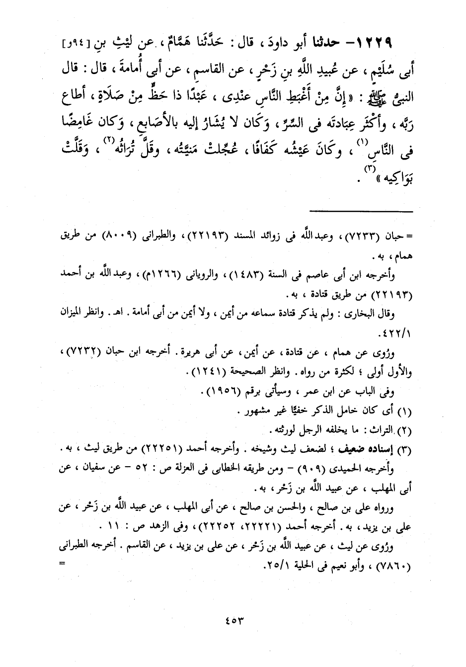 1229 - حَدَّثَنَا أَبُو دَاوُدَ قَالَ: حَدَّثَنَا هَمَّامٌ، عَنْ لَيْثِ بْنِ أَبِي سُلَيْمٍ، عَنْ عُبَيْدِ اللَّهِ بْنِ زَحْرٍ، عَنِ الْقَاسِمِ، عَنْ أَبِي أُمَامَةَ، قَالَ: قَالَ النَّبِيُّ صَلَّى اللهُ عَلَيْهِ وَسَلَّمَ: «إِنَّ §مِنْ أَغْبَطِ النَّاسِ عِنْدِي عَبْدًا ذَا حَظٍّ مِنْ صَلَاةٍ أَطَاعَ رَبَّهُ وَأَكْثَرَ عِبَادَتَهُ فِي السِّرِّ، وَكَانَ لَا يُشَارُ إِلَيْهِ بِالْأَصَابِعِ وَكَانَ غَامِضًا فِي النَّاسِ، وَكَانَ عَيْشُهُ كَفَافًا عُجِّلَتْ مَنِيَّتُهُ وَقَلَّ تُرَاثُهُ وَقَلَّتْ بَوَاكِيهِ»