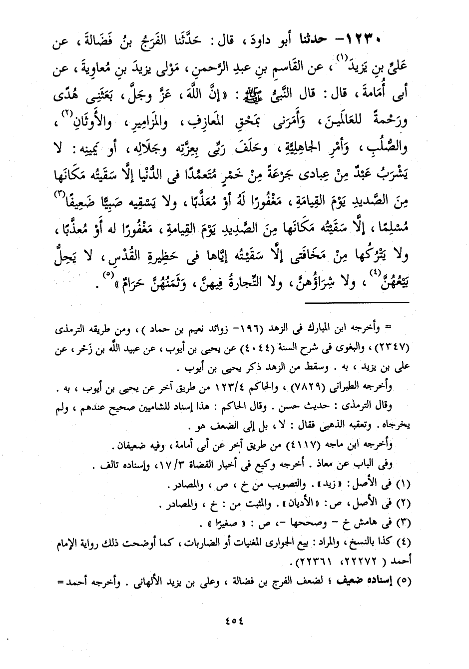 1230 - حَدَّثَنَا أَبُو دَاوُدَ قَالَ: حَدَّثَنَا الْفَرَجُ بْنُ فَضَالَةَ، عَنْ عَلِيِّ بْنِ يَزِيدَ، عَنِ الْقَاسِمِ بْنِ عَبْدِ الرَّحْمَنِ مَوْلَى يَزِيدَ بْنِ مُعَاوِيَةَ عَنْ أَبِي أُمَامَةَ، قَالَ: قَالَ النَّبِيُّ صَلَّى اللهُ عَلَيْهِ وَسَلَّمَ: إِنَّ §اللَّهَ عَزَّ وَجَلَّ بَعَثَنِي هُدًى وَرَحْمَةً لِلْعَالَمِينَ وَأَمَرَنِي بِمَحْقِ، الْمَعَازِفِ، وَالْمَزَامِيرِ، وَالْأَوْثَانِ وَالصُّلُبِ وَأَمْرِ الْجَاهِلِيَّةِ، وَحَلَفَ رَبِّي بِعِزَّتِهِ وَجَلَالِهِ أَوْ يَمِينِهِ: «لَا يَشْرَبُ عَبْدٌ مِنِ عِبَادِي جَرْعَةً مِنْ خَمْرٍ مُتَعَمِّدًا فِي الدُّنْيَا إِلَّا سَقَيْتُهُ مَكَانَهَا مِنَ الصَّدِيدِ يَوْمَ الْقِيَامَةِ مَغْفُورًا لَهُ أَوْ مُعَذَّبًا، وَلَا يَسْقِيهِ صَبِيًّا ضَعِيفًا مُسْلِمًا إِلَّا سَقَيْتُهُ مَكَانَهَا مِنَ الصَّدِيدِ يَوْمَ الْقِيَامَةِ مَغْفُورًا لَهُ أَوْ مُعَذَّبًا وَلَا يَتْرُكُهَا مِنْ مَخَافَتِي إِلَّا سَقَيْتُهُ إِيَّاهَا فِي حَظِيرَةِ الْقُدْسِ، لَا يَحِلُّ بَيْعُهُنَّ وَلَا شِرَاؤُهُنَّ وَلَا التِّجَارَةُ فِيهِنَّ وَثَمَنُهُنَّ حَرَامٌ»