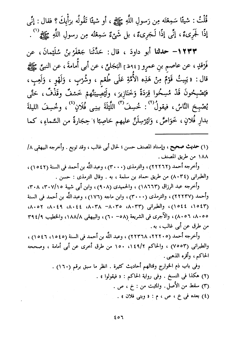 1233 - حَدَّثَنَا أَبُو دَاوُدَ قَالَ: حَدَّثَنَا جَعْفَرُ بْنُ سُلَيْمَانَ، عَنْ فَرْقَدٍ، عَنْ عَاصِمِ بْنِ عَمْرٍو الْبَجَلِيِّ، عَنْ أَبِي أُمَامَةَ، عَنِ النَّبِيِّ صَلَّى اللهُ عَلَيْهِ وَسَلَّمَ قَالَ: «§يَبِيتُ قَوْمٌ مِنْ هَذِهِ الْأُمَّةِ عَلَى طُعْمٍ وَشُرْبٍ وَلَهْو وَلَعِبٍ فَيُصْبِحُونَ قَدْ مُسِخُوا قِرَدَةً وَخَنَازِيرَ وَلَيُصِيبَنَّهُمْ خَسْفٌ وَقَذْفٌ حَتَّى يُصْبِحَ النَّاسُ فَيَقُولُ خُسِفَ اللَّيْلَةَ بِبَنِي فُلَانٍ وَخُسِفَ اللَّيْلَةَ بِدَارِ فُلَانٍ خَوَاصَّ وَلَيُرْسِلَنَّ عَلَيْهِمْ حَاصِبًا حِجَارَةً مِنَ السَّمَاءِ كَمَا -[457]- أُرْسِلَتْ عَلَى قَوْمِ لُوطٍ عَلَى قَبَائِلَ مِنْهَا وَعَلَى دُورٍ وَلَيُرْسِلَنَّ عَلَيْهِمُ الرِّيحَ الْعَقِيمَ الَّذِي أَهْلَكَتْ عَادًا عَلَى قَبَائِلَ فِيهَا وَعَلَى دُورٍ بِشُرْبِهِمُ الْخَمْرَ وَلُبْسِهِمُ الْحَرِيرَ وَاتِّخَاذِهِمُ الْقَيْنَاتِ وَأَكْلِهِمُ الرِّبَا وَقَطِيعَتِهِمُ الرَّحِمَ» وَخَصْلَةٌ نَسِيَهَا جَعْفَرٌ
