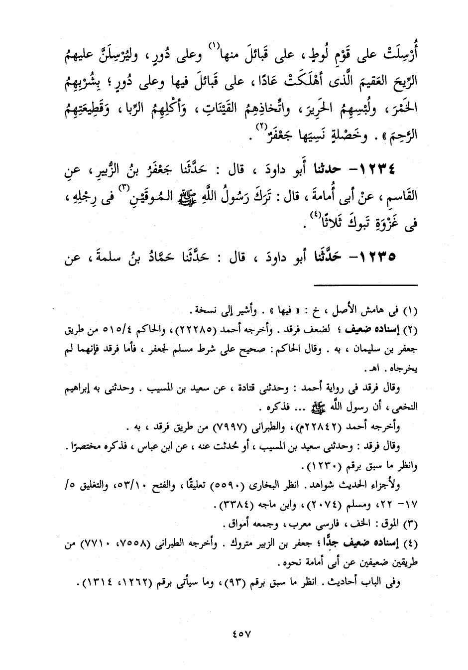 1234 - حَدَّثَنَا أَبُو دَاوُدَ قَالَ: حَدَّثَنَا جَعْفَرُ بْنُ الزُّبَيْرِ، عَنِ الْقَاسِمِ، عَنْ أَبِي أُمَامَةَ، قَالَ: «§تَرَكَ رَسُولُ اللَّهِ صَلَّى اللهُ عَلَيْهِ وَسَلَّمَ الْمُوقَيْنِ فِي رِجْلِهِ فِي غَزْوَةِ تَبُوكَ ثَلَاثًا»