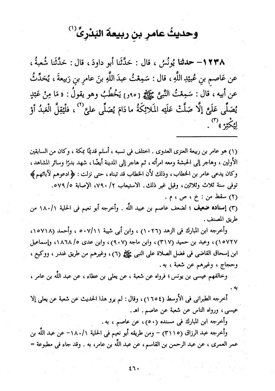 1238 - حَدَّثَنَا يُونُسُ قَالَ: حَدَّثَنَا أَبُو دَاوُدَ قَالَ: حَدَّثَنَا شُعْبَةُ، عَنْ عَاصِمِ بْنِ عُبَيْدِ اللَّهِ، قَالَ: سَمِعْتُ عَبْدَ اللَّهِ بْنَ عَامِرِ بْنِ رَبِيعَةَ، يُحَدِّثُ عَنْ أَبِيهِ، قَالَ: سَمِعْتُ النَّبِيَّ صَلَّى اللهُ عَلَيْهِ وَسَلَّمَ يَخْطُبُ وَهُوَ يَقُولُ: «§مَا مِنْ عَبْدٍ يُصَلِّي عَلَيَّ إِلَّا صَلَّتْ عَلَيْهِ الْمَلَائِكَةُ مَا دَامَ يُصَلِّي عَلَيَّ فَلْيُقِلَّ الْعَبْدُ أَوْ لِيُكْثِرْ»