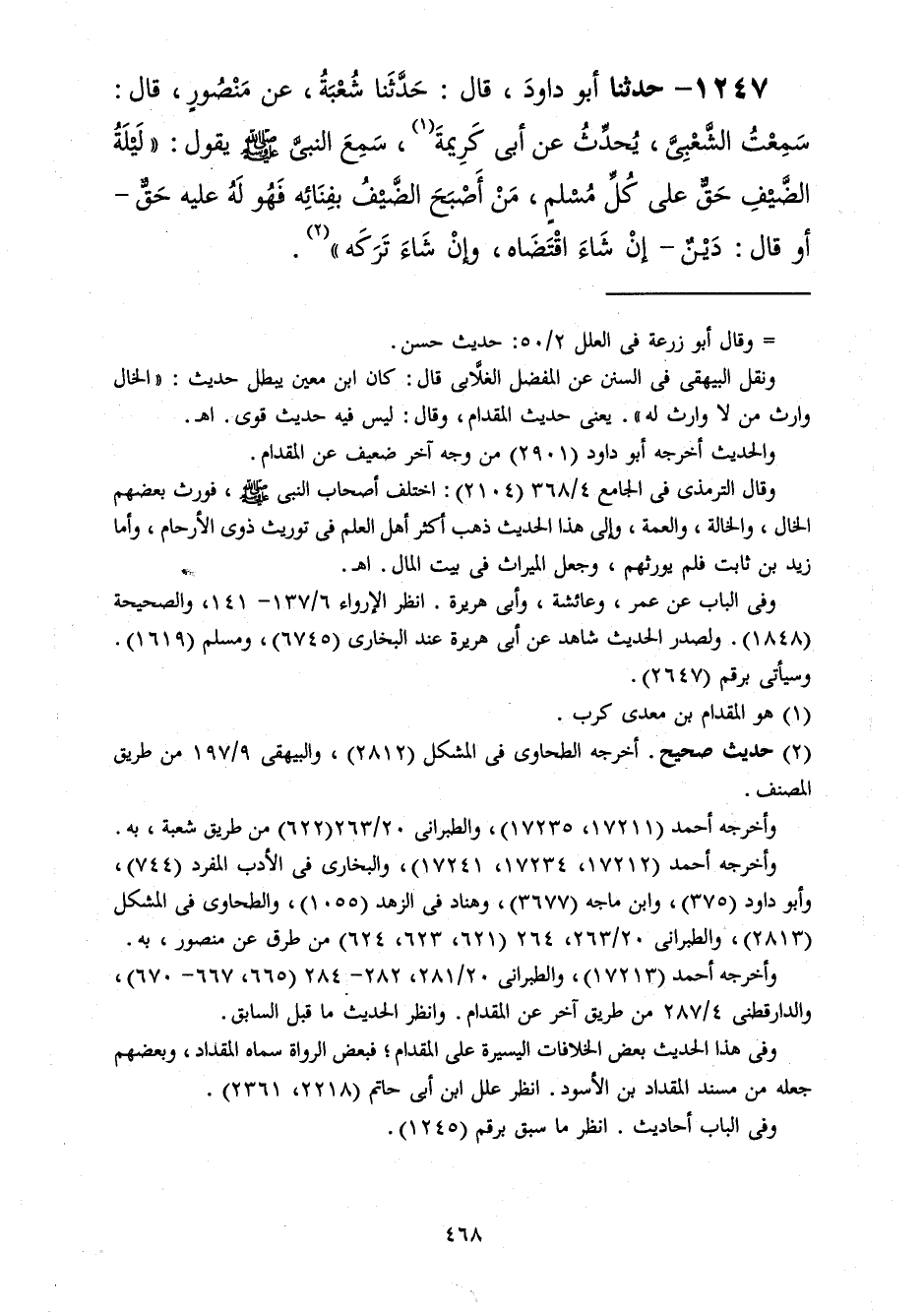 1247 - حَدَّثَنَا أَبُو دَاوُدَ قَالَ: حَدَّثَنَا شُعْبَةُ، عَنْ مَنْصُورٍ، قَالَ: سَمِعْتُ الشَّعْبِيَّ، يُحَدِّثُ عَنْ أَبِي كَرِيمَةَ، سَمِعَ النَّبِيَّ صَلَّى اللهُ عَلَيْهِ وَسَلَّمَ يَقُولُ: " §لَيْلَةُ الضَّيْفِ حَقٌّ عَلَى كُلِّ مُسْلِمٍ مَنْ أَصْبَحَ الضَّيْفُ بِفِنَائِهِ فَهُوَ لَهُ عَلَيْهِ حَقٌّ - أَوْ قَالَ: دَيْنٌ - إِنْ شَاءَ اقْتَضَاهُ وَإِنْ شَاءَ تَرَكَهُ "