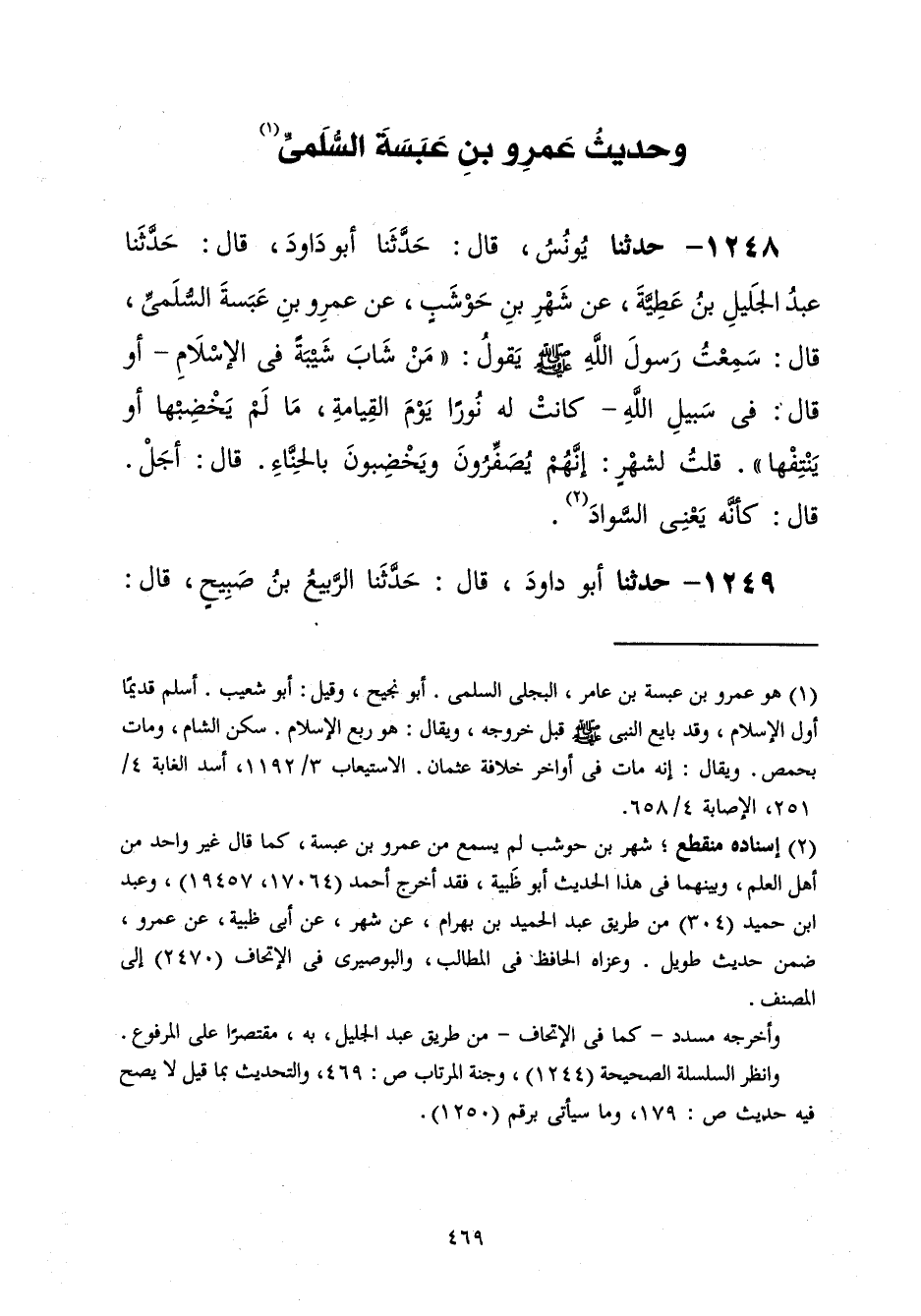 1248 - حَدَّثَنَا يُونُسُ قَالَ: حَدَّثَنَا أَبُو دَاوُدَ قَالَ: حَدَّثَنَا عَبْدُ الْجَلِيلِ بْنُ عَطِيَّةَ، عَنْ شَهْرِ بْنِ حَوْشَبٍ، عَنْ عَمْرِو بْنِ عَبَسَةَ السُّلَمِيِّ، قَالَ: سَمِعْتُ رَسُولَ اللَّهِ صَلَّى اللهُ عَلَيْهِ وَسَلَّمَ يَقُولُ: " §مَنْ شَابَ شَيْبَةً فِي الْإِسْلَامِ - أَوْ قَالَ: فِي سَبِيلِ اللَّهِ - كَانَتْ لَهُ نُورًا يَوْمَ الْقِيَامَةِ مَا لَمْ يَخْضِبْهَا أَوْ يَنْتِفْهَا " قُلْتُ لِشَهْرٍ: إِنَّهُمْ يُصَفِّرُونَ وَيَخْضِبُونَ بِالْحِنَّاءِ؟ قَالَ: أَجَلْ قَالَ: كَأَنَّهُ يَعْنِي السَّوَادَ
