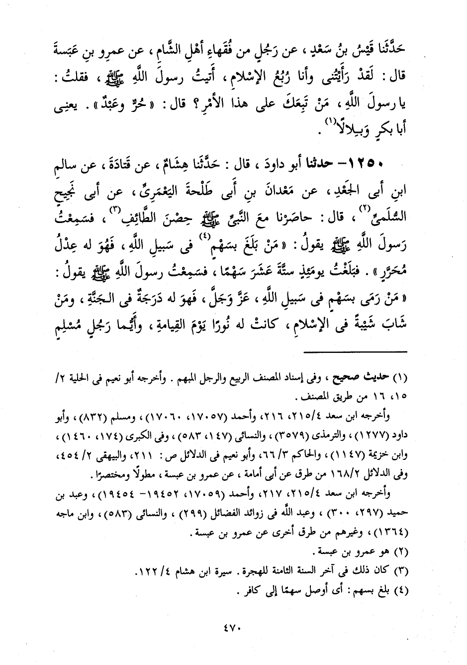 1250 - حَدَّثَنَا أَبُو دَاوُدَ قَالَ: حَدَّثَنَا هِشَامٌ، عَنْ قَتَادَةَ، عَنْ سَالِمِ بْنِ أَبِي الْجَعْدِ، عَنْ مَعْدَانَ بْنِ أَبِي طَلْحَةَ الْيَعْمَرِيِّ، عَنْ أَبِي نَجِيحٍ السُّلَمِيِّ، قَالَ: حَاصَرْنَا مَعَ النَّبِيِّ صَلَّى اللهُ عَلَيْهِ وَسَلَّمَ حِصْنَ الطَّائِفِ فَسَمِعْتُ رَسُولَ اللَّهِ صَلَّى اللهُ عَلَيْهِ وَسَلَّمَ يَقُولُ: «§مَنْ بَلَغَ بِسَهْمٍ فِي سَبِيلِ اللَّهِ فَهُوَ لَهُ عِدْلُ مُحَرَّرٍ» فَبَلَغْتُ يَوْمَئِذٍ سِتَّةَ عَشَرَ سَهْمًا فَسَمِعْتُ رَسُولَ اللَّهِ صَلَّى اللهُ عَلَيْهِ وَسَلَّمَ يَقُولُ: «مَنْ رَمَى بِسَهْمٍ فِي سَبِيلِ اللَّهِ عَزَّ وَجَلَّ فَهُوَ لَهُ دَرَجَةٌ فِي الْجَنَّةِ، وَمَنْ شَابَ شَيْبَةً فِي الْإِسْلَامِ كَانَتْ لَهُ نُورًا يَوْمَ الْقِيَامَةِ وَأَيُّمَا رَجُلٍ مُسْلِمٍ -[471]- أَعْتَقَ رَجُلًا مُسْلِمًا فَإِنَّ اللَّهَ عَزَّ وَجَلَّ لَهُ جَاعِلٌ وِقَاءَ كُلِّ عَظْمٍ مِنْ عِظَامِهِ مُحَرَّرَةً مِنَ النَّارِ، وَأَيُّمَا امْرَأَةٍ مَسْلَمَةٍ أَعْتَقَتِ امْرَأَةً مَسْلَمَةً فَإِنَّ اللَّهَ عَزَّ وَجَلَّ جَاعِلٌ وِقَاءَ كُلِّ عَظْمٍ مِنْ عِظَامِهَا عَظْمًا مِنْ عِظَامِهَا مُحَرَّرَةً مِنَ النَّارِ»
