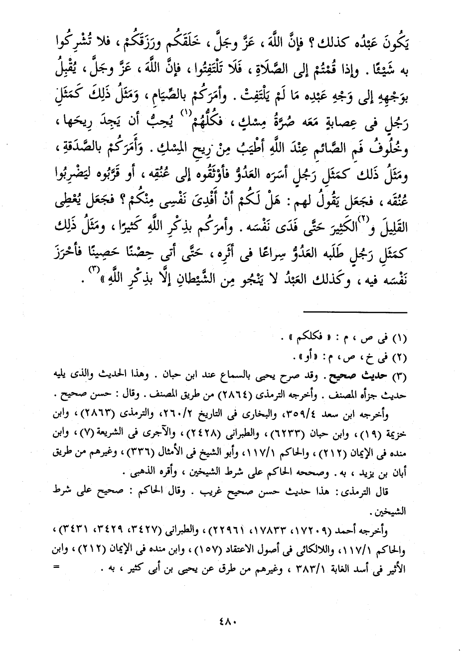 فَإِنَّ مَثَلَ مَنْ أَشْرَكَ بِاللهِ كَمَثَلِ رَجُلٍ اشْتَرَى عَبْدًا مِنْ خَالِصِ مَالِهِ بِذَهَبٍ، أَوْ وَرِقٍ ثُمَّ أَسْكَنَهُ دَارًا، فَقَالَ: اعْمَلْ وَارْفَعْ إِلَيَّ فَجَعَلَ الْعَبْدُ يَرْفَعُ إِلَى غَيْرِ سَيِّدِهِ، فَأَيُّكُمْ يَرْضَى أَنْ يَكُونَ عَبْدُهُ كَذَلِكَ؟ فَإِنَّ اللَّهَ عَزَّ وَجَلَّ خَلَقَكُمْ وَرَزَقَكُمْ فَلاَ تُشْرِكُوا بِهِ شَيْئًا، وَإِذَا قُمْتُمْ إِلَى الصَّلاَةِ فَلاَ تَلْتَفِتُوا فَإِنَّ اللَّهَ عَزَّ وَجَلَّ يُقْبِلُ بِوَجْهِهِ إِلَى وَجْهِ عَبْدِهِ مَا لَمْ يَلْتَفِتْ، وَأَمَرَكُمْ بِالصِّيَامِ، وَمَثَلُ ذَلِكَ كَمَثَلِ رَجُلٍ فِي عِصَابَةٍ مَعَهُ صُرَّةُ مِسْكٍ فَكُلُّهُمْ يُحِبُّ أَنْ يَجِدَ رِيحَهَا، وَخُلُوفُ فَمِ الصَّائِمِ عِنْدَ اللهِ أَطْيَبُ مِنْ رِيحِ الْمِسْكِ، وَأَمَرَكُمْ بِالصَّدَقَةِ، وَمَثَلُ ذَلِكَ كَمَثَلِ رَجُلٍ أَسَرَهُ الْعَدُوُّ فَأَوْثَقُوهُ إِلَى عُنُقِهِ، أَوْ قَرَّبُوهُ لِيَضْرِبُوا عُنُقَهُ، فَجَعَلَ يَقُولُ لَهُمْ: هَلْ لَكُمْ أَنْ أَفْدِيَ نَفْسِي مِنْكُمْ فَجَعَلَ يُعْطِي الْقَلِيلَ وَالْكَثِيرَ حَتَّى فَدَى نَفْسَهُ، وَأَمَرَكُمْ بِذِكْرِ اللهِ كَثِيرًا وَمَثَلُ ذَلِكَ كَمَثَلِ رَجُلٍ طَلَبَهُ الْعَدُوُّ سِرَاعًا فِي أَثَرِهِ حَتَّى أَتَى حِصْنًا حَصِينًا فَأَحْرَزَ نَفْسَهُ فِيهِ، وَكَذَلِكَ الْعَبْدُ لاَ يَنْجُو مِنَ الشَّيْطَانِ إِلاَّ بِذِكْرِ اللهِ.