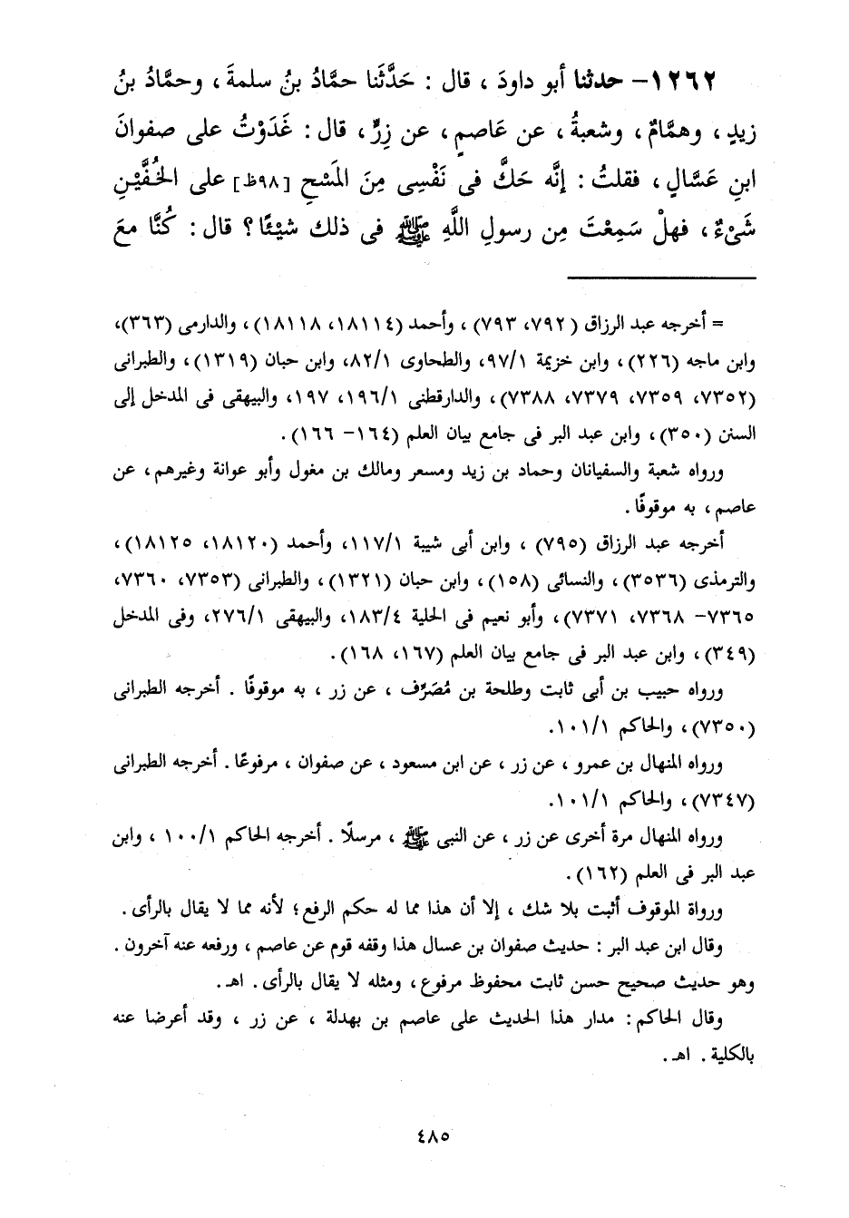 1262 - حَدَّثَنَا أَبُو دَاوُدَ قَالَ: حَدَّثَنَا حَمَّادُ بْنُ سَلَمَةَ، وَحَمَّادُ بْنُ زَيْدٍ، وَهَمَّامٌ، وَشُعْبَةُ، عَنْ عَاصِمٍ، عَنْ زِرٍّ، قَالَ: غَدَوْتُ عَلَى صَفْوَانَ بْنِ عَسَّالٍ فَقُلْتُ: إِنَّهُ حَكَّ فِي نَفْسِي مِنَ الْمَسْحِ عَلَى الْخُفَّيْنِ شَيْءٌ فَهَلْ سَمِعْتَ مِنْ رَسُولِ اللَّهِ صَلَّى اللهُ عَلَيْهِ وَسَلَّمَ فِي ذَلِكَ شَيْئًا؟ قَالَ: كُنَّا مَعَ -[486]- النَّبِيِّ صَلَّى اللهُ عَلَيْهِ وَسَلَّمَ سَفْرًا - أَوْ مُسَافِرِينَ - «§فَأَمَرَنَا أَنْ نَمْسَحَ عَلَيْهِمَا ثَلَاثَةَ أَيَّامٍ وَلَيَالِيَهُنَّ مِنْ غَائِطٍ وَبَوْلٍ وَنَوْمٍ إِلَّا مِنْ جَنَابَةٍ»