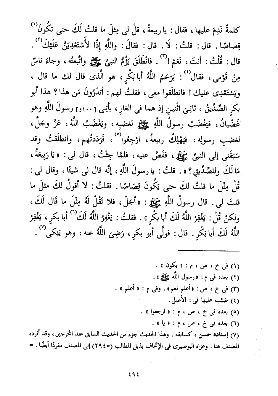 فَقُلْتُ لَهُمْ: أَتَدْرُونَ مَنْ هَذَا؟ هَذَا أَبُو بَكْرٍ الصِّدِّيقُ ثَانِيَ اثْنَيْنِ إِذْ هُمَا فِي الْغَارِ يَأْتِي رَسُولَ اللهِ صَلَّى الله عَلَيْهِ وَسَلَّمَ وَهُوَ غَضْبَانُ، فَيَغْضَبُ رَسُولُ اللهِ صَلَّى الله عَلَيْهِ وَسَلَّمَ لِغَضَبِهِ، وَيَغْضَبُ اللهُ عَزَّ وَجَلَّ لِغَضَبِ رَسُولِهِ فَيَهْلِكُ رَبِيعَةُ، ارْجِعُوا فَرَدَدْتُهُمْ وَانْطَلَقْتُ وَقَدْ سَبَقَنِي إِلَى النَّبِيِّ صَلَّى الله عَلَيْهِ وَسَلَّمَ فَقَصَّ عَلَيْهِ فَلَمَّا جِئْتُ قَالَ لِي: يَا رَبِيعَةُ مَا لَكَ وَلِلصِّدِّيقِ؟ قُلْتُ: يَا رَسُولَ اللهِ، إِنَّهُ قَالَ لِي شَيْئًا وَقَالَ لِي: قُلْ مِثْلَ مَا قُلْتُ لَكَ حَتَّى يَكُونَ قِصَاصًا، فَقُلْتُ: لاَ أَقُولُ لَكَ مِثْلَ مَا قُلْتَ لِي، قَالَ رَسُولُ اللهِ صَلَّى الله عَلَيْهِ وَسَلَّمَ: أَجَلْ فَلاَ تَقُلْ لَهُ مِثْلَ مَا قَالَ لَكَ وَلَكِنْ قُلْ: يَغْفِرُ اللهُ لَكَ أَبَا بَكْرٍ، فَقُلْتُ: يَغْفِرُ اللهُ لَكَ أَبَا بَكْرٍ، يَغْفِرُ اللهُ لَكَ أَبَا بَكْرٍ، فَوَلَّى أَبُو بَكْرٍ رَضِيَ اللهُ عَنْهُ وَهُوَ يَبْكِي.