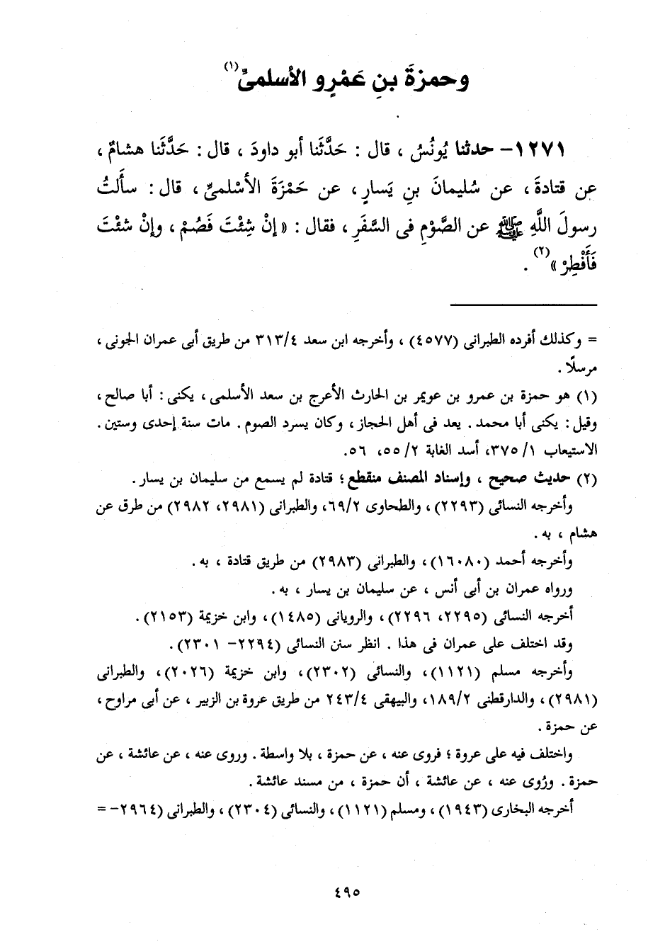 1271 - حَدَّثَنَا يُونُسُ قَالَ: حَدَّثَنَا أَبُو دَاوُدَ قَالَ: حَدَّثَنَا هِشَامٌ، عَنْ قَتَادَةَ، عَنْ سُلَيْمَانَ بْنِ يَسَارٍ، عَنْ حَمْزَةَ الْأَسْلَمِيِّ، قَالَ: سَأَلْتُ رَسُولَ اللَّهِ صَلَّى اللهُ عَلَيْهِ وَسَلَّمَ عَنِ الصَّوْمِ فِي السَّفَرِ فَقَالَ: «§إِنْ شِئْتَ فَصُمْ وَإِنْ شِئْتَ فَأَفْطِرْ»