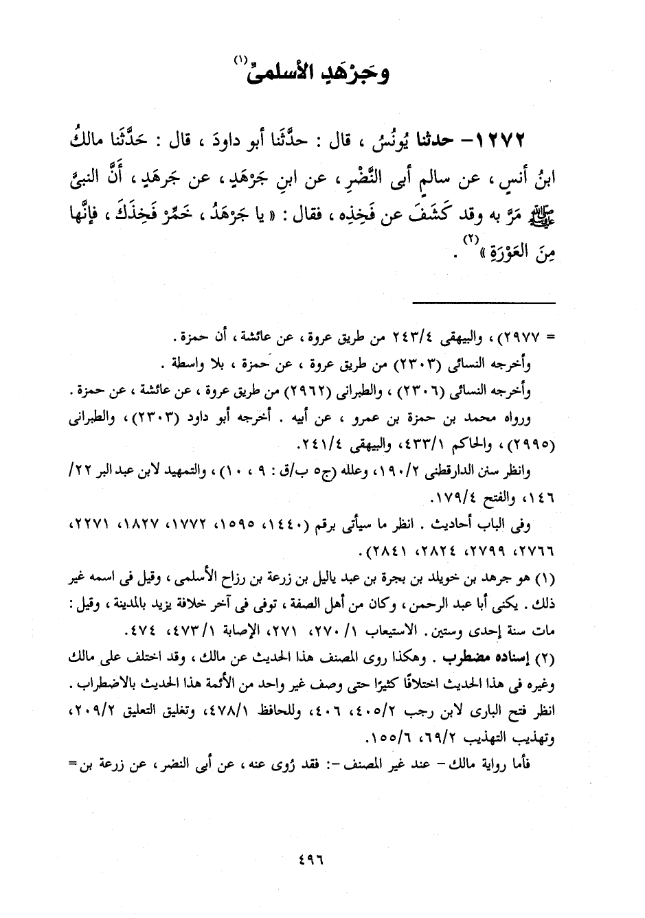 1272 - حَدَّثَنَا يُونُسُ قَالَ: حَدَّثَنَا أَبُو دَاوُدَ قَالَ: حَدَّثَنَا مَالِكُ بْنُ أَنَسٍ، عَنْ سَالِمٍ أَبِي النَّضْرِ، عَنِ ابْنِ جَرْهَدٍ، عَنْ جَرْهَدٍ، أَنَّ النَّبِيَّ صَلَّى اللهُ عَلَيْهِ وَسَلَّمَ مَرَّ بِهِ وَقَدْ كَشَفَ عَنْ فَخِذِهِ فَقَالَ: «يَا جَرْهَدُ §خَمِّرْ فَخِذَكَ فَإِنَّهَا مِنَ الْعَوْرَةِ»