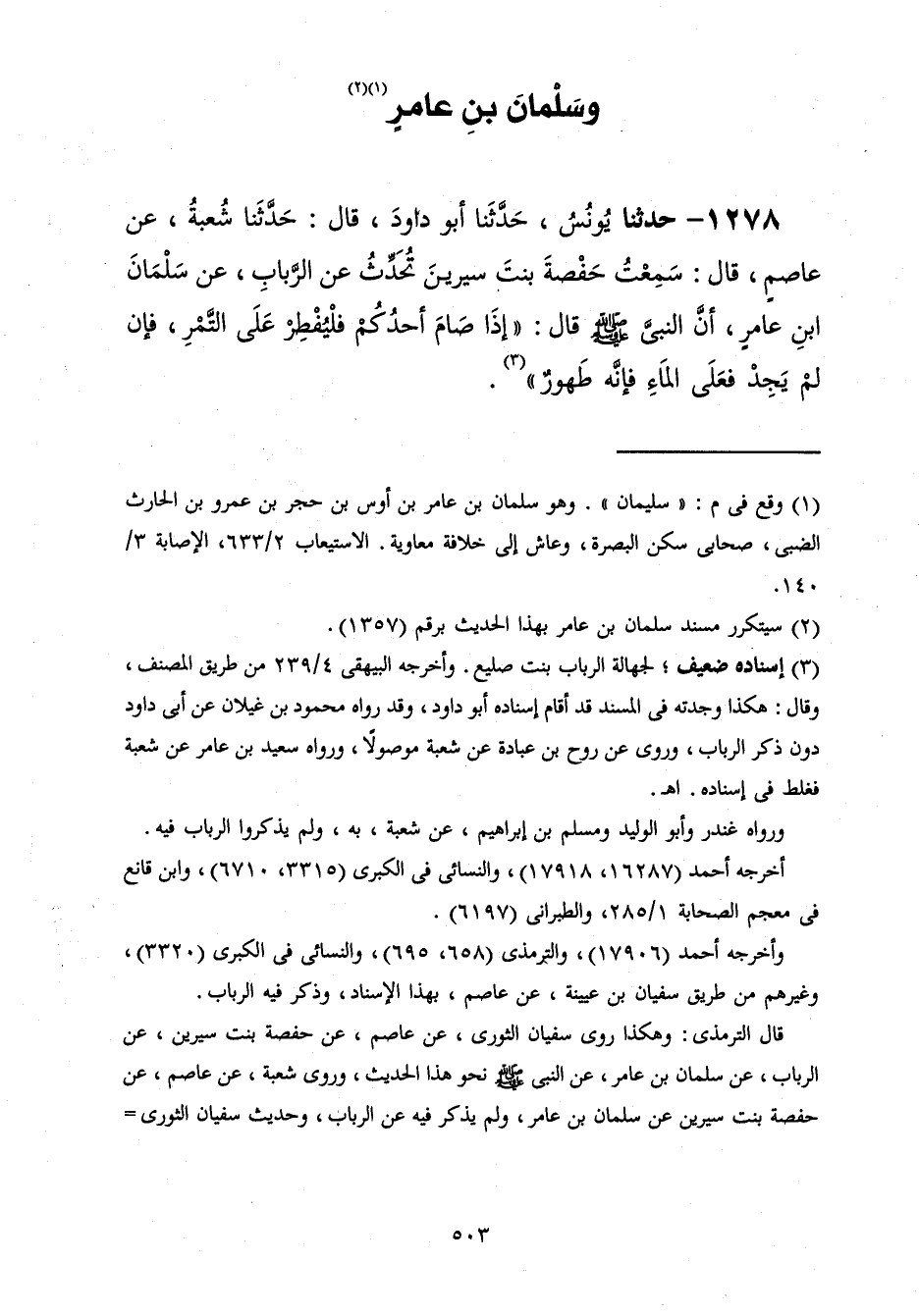 1278 - حَدَّثَنَا يُونُسُ قَالَ: حَدَّثَنَا أَبُو دَاوُدَ قَالَ: حَدَّثَنَا شُعْبَةُ، عَنْ عَاصِمٍ، قَالَ: سَمِعْتُ حَفْصَةَ بِنْتَ سِيرِينَ، تُحَدِّثُ عَنِ الرَّبَابِ، عَنْ سَلْمَانَ بْنِ عَامِرٍ، أَنَّ النَّبِيَّ صَلَّى اللهُ عَلَيْهِ وَسَلَّمَ قَالَ: «§إِذَا صَامَ أَحَدُكُمْ فَلْيُفْطِرْ عَلَى التَّمْرِ فَإِنْ لَمْ يَجِدْ فَعَلَى الْمَاءِ فَإِنَّهُ طَهُورٌ»