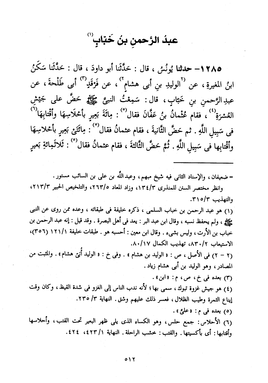 1285 - حَدَّثَنَا يُونُسُ قَالَ: حَدَّثَنَا أَبُو دَاوُدَ قَالَ: حَدَّثَنَا سَكَنُ بْنُ الْمُغِيرَةِ، عَنِ الْوَلِيدِ بْنِ أَبِي هِشَامٍ، عَنْ فَرْقَدٍ أَبِي طَلْحَةَ، عَنْ عَبْدِ الرَّحْمَنِ بْنِ خَبَّابٍ، قَالَ: سَمِعْتُ النَّبِيَّ صَلَّى اللهُ عَلَيْهِ وَسَلَّمَ حَضَّ عَلَى جَيْشِ الْعُسْرَةِ فَقَامَ عُثْمَانُ بْنُ عَفَّانَ فَقَالَ: مِائَةَ بَعِيرٍ بِأَحْلَاسِهَا وَأَقْتَابِهَا فِي سَبِيلِ اللَّهِ، ثُمَّ حَضَّ الثَّانِيَةَ فَقَامَ عُثْمَانُ فَقَالَ: مِائَتَيْ بَعِيرٍ بِأَحْلَاسِهَا وَأَقْتَابِهَا فِي سَبِيلِ اللَّهِ، ثُمَّ حَضَّ الثَّالِثَةَ فَقَامَ عُثْمَانُ فَقَالَ: ثَلَاثَمِائَةِ بَعِيرٍ -[513]- بِأَحْلَاسِهَا وَأَقْتَابِهَا فِي سَبِيلِ اللَّهِ قَالَ: فَرَأَيْتُ رَسُولَ اللَّهِ صَلَّى اللهُ عَلَيْهِ وَسَلَّمَ يَنْزِلُ عَنِ الْمِنْبَرِ وَهُوَ يَقُولُ: «§مَا عَلَى عُثْمَانَ مَا عَمِلَ بَعْدَ هَذَا» مَرَّتَيْنِ أَوْ ثَلَاثًا