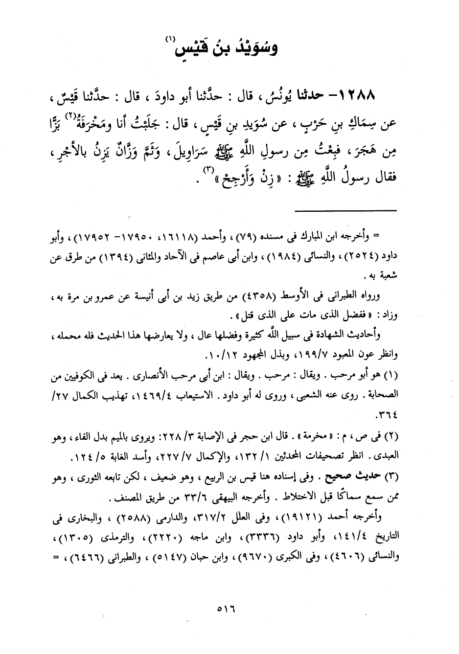 1288 - حَدَّثَنَا يُونُسُ قَالَ: حَدَّثَنَا أَبُو دَاوُدَ قَالَ: حَدَّثَنَا قَيْسٌ، عَنْ سِمَاكِ بْنِ حَرْبٍ، عَنْ سُوَيْدِ بْنِ قَيْسٍ، قَالَ: جَلَبْتُ أَنَا وَمَخْرَفَةُ بَزًّا مِنْ هَجَرَ فَبِعْتُ مِنْ رَسُولِ اللَّهِ صَلَّى اللهُ عَلَيْهِ وَسَلَّمَ سَرَاوِيلَ وَثَمَّ وَزَّانٌ يَزِنُ بِالْأَجْرِ فَقَالَ رَسُولُ اللَّهِ صَلَّى اللهُ عَلَيْهِ وَسَلَّمَ: «§زِنْ وَأَرْجِحْ»