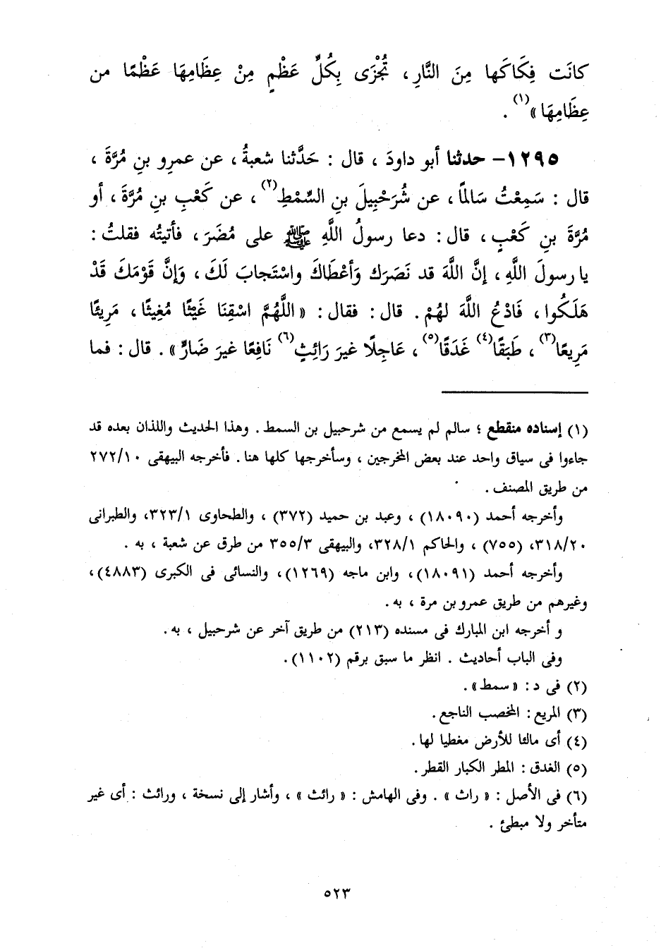 1295 - حَدَّثَنَا أَبُو دَاوُدَ قَالَ: حَدَّثَنَا شُعْبَةُ، عَنْ عَمْرِو بْنِ مُرَّةَ، قَالَ: سَمِعْتُ سَالِمًا، عَنْ شُرَحْبِيلَ بْنِ السِّمْطِ، عَنْ كَعْبِ بْنِ مُرَّةَ أَوْ مُرَّةَ بْنِ كَعْبٍ قَالَ: دَعَا رَسُولُ اللَّهِ صَلَّى اللهُ عَلَيْهِ وَسَلَّمَ عَلَى مُضَرَ فَأَتَيْتُهُ فَقُلْتُ: يَا رَسُولَ اللَّهِ، إِنَّ اللَّهَ قَدْ نَصَرَكَ وَأَعْطَاكَ وَاسْتَجَابَ لَكَ وَإِنَّ قَوْمَكَ قَدْ هَلَكُوا فَادْعُ اللَّهَ لَهُمْ قَالَ: فَقَالَ: «§اللَّهُمَّ اسْقِنَا غَيْثًا مُغِيثًا، مَرِيئًا مَرِيعًا، طَبَقًا غَدَقًا عَاجِلًا غَيْرَ رَائِثٍ نَافِعًا غَيْرَ ضَارٍّ» قَالَ: فَمَا -[524]- كَانَتِ الْجُمُعَةُ الْأُخْرَى أَوْ نَحْوُهَا حَتَّى مُطِرْنَا