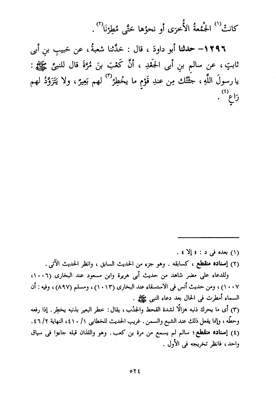 1296 - حَدَّثَنَا أَبُو دَاوُدَ قَالَ: حَدَّثَنَا شُعْبَةُ، عَنْ حَبِيبِ بْنِ أَبِي ثَابِتٍ، عَنْ سَالِمِ بْنِ أَبِي الْجَعْدِ، أَنَّ كَعْبَ بْنَ مُرَّةَ، قَالَ لِلنَّبِيِّ صَلَّى اللهُ عَلَيْهِ وَسَلَّمَ: «يَا رَسُولَ اللَّهِ، §جِئْتُكَ مِنْ عِنْدِ قَوْمٍ مَا يَخْطِرُ لَهُمْ بَعِيرٌ وَلَا يَتَزَوَّدُ لَهُمْ رَاعٍ»