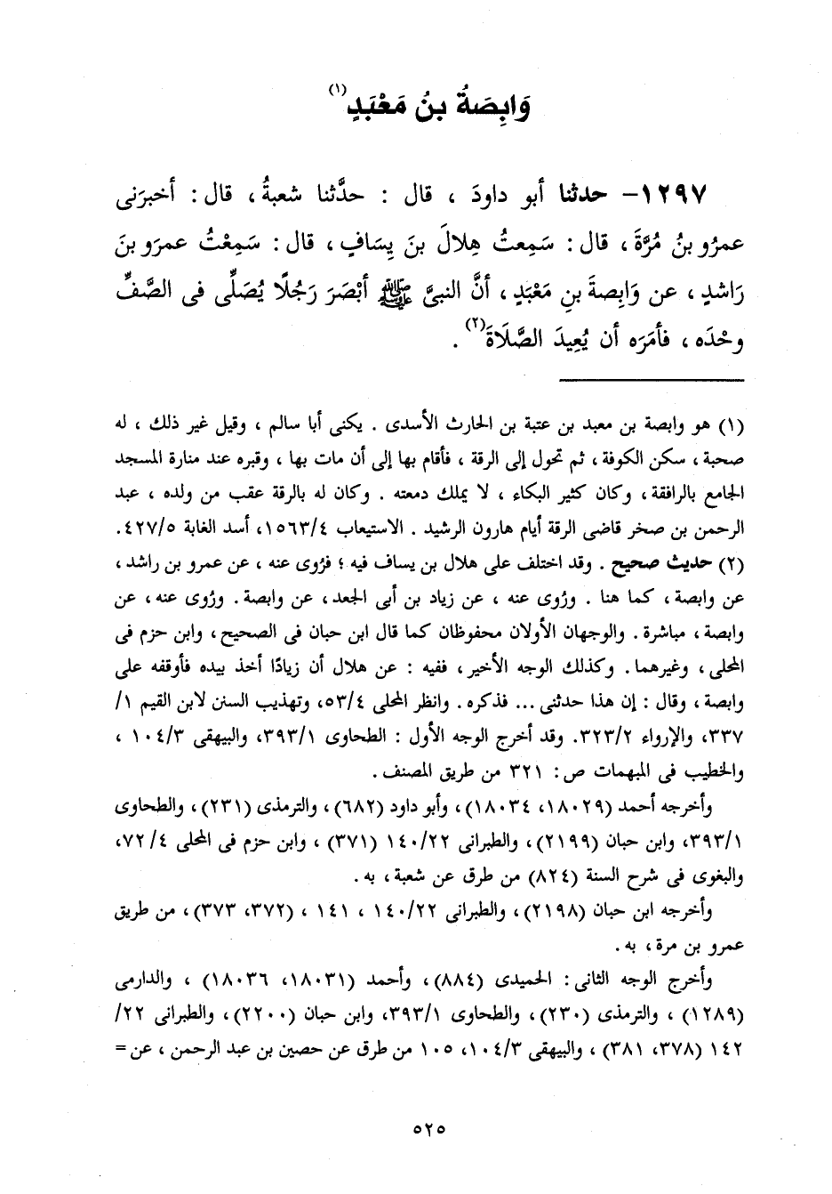 1297 - حَدَّثَنَا أَبُو دَاوُدَ قَالَ: حَدَّثَنَا شُعْبَةُ، قَالَ: أَخْبَرَنِي عَمْرُو بْنُ مُرَّةَ، قَالَ: سَمِعْتُ هِلَالَ بْنَ يِسَافٍ، قَالَ: سَمِعْتُ عَمْرَو بْنَ رَاشِدٍ، عَنْ وَابِصَةَ بْنِ مَعْبَدٍ، أَنَّ النَّبِيَّ صَلَّى اللهُ عَلَيْهِ وَسَلَّمَ «§أَبْصَرَ رَجُلًا يُصَلِّي فِي الصَّفِّ وَحْدَهُ فَأَمَرَهُ أَنْ يُعِيدَ الصَّلَاةَ»
