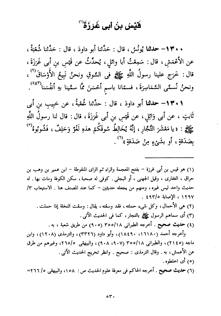 1300 - حَدَّثَنَا يُونُسُ قَالَ: حَدَّثَنَا أَبُو دَاوُدَ قَالَ: حَدَّثَنَا شُعْبَةُ، عَنِ الْأَعْمَشِ، قَالَ: سَمِعْتُ أَبَا وَائِلٍ، يُحَدِّثُ عَنْ قَيْسِ بْنِ أَبِي غَرَزَةَ، قَالَ: «خَرَجَ عَلَيْنَا رَسُولُ اللَّهِ صَلَّى اللهُ عَلَيْهِ وَسَلَّمَ فِي السُّوقِ وَنَحْنُ نَبِيعُ الْأَوْسَاقَ وَنَحْنُ §نُسَمَّى السَّمَاسِرَةَ فَسَمَّانَا بِاسْمٍ أَحْسَنَ مِمَّا سَمَّيْنَا بِهِ أَنْفُسَنَا»