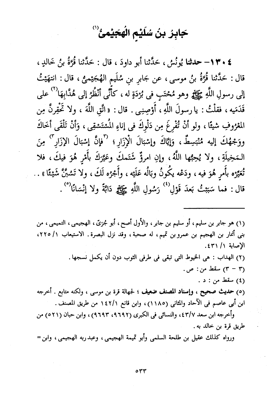 1304 - حَدَّثَنَا يُونُسُ قَالَ: حَدَّثَنَا أَبُو دَاوُدَ قَالَ: حَدَّثَنَا قُرَّةُ بْنُ خَالِدٍ، قَالَ: حَدَّثَنَا قُرَّةُ بْنُ مُوسَى، عَنْ جَابِرِ بْنِ سُلَيْمٍ الْهُجَيْمِيِّ، قَالَ: انْتَهَيْتُ إِلَى رَسُولِ اللَّهِ صَلَّى اللهُ عَلَيْهِ وَسَلَّمَ وَهُوَ مُحْتَبٍ فِي بُرْدَةٍ لَهُ كَأَنِّي أَنْظُرُ إِلَى هُدَّابِهَا عَلَى قَدَمَيْهِ فَقُلْتُ: يَا رَسُولَ اللَّهِ، أَوْصِنِي قَالَ: «§اتَّقِ اللَّهَ وَلَا تَحْقِرَنَّ مِنَ الْمَعْرُوفِ شَيْئًا وَلَوْ أَنْ تُفْرِغَ مِنْ دَلْوِكَ فِي إِنَاءِ الْمُسْتَسْقِي وَأَنْ تَلْقَى أَخَاكَ وَوَجْهُكَ إِلَيْهِ مُنْبَسِطٌ، وَإِيَّاكَ وَإِسْبَالَ الْإِزَارِ فَإِنَّ إِسْبَالَ الْإِزَارِ مِنَ الْمَخِيلَةِ وَلَا يُحِبُّهَا اللَّهُ، وَإِنِ امْرُؤٌ شَتَمَكَ وَعَيَّرَكَ بِأَمْرٍ هُوَ فِيكَ فَلَا تُعَيِّرْهُ بِأَمْرٍ هُوَ فِيهِ وَدَعْهُ يَكُونُ وَبَالُهُ عَلَيْهِ وَأَجْرُهُ لَكَ، وَلَا تَسُبَّنَّ شَيْئًا» قَالَ: فَمَا سَبَبْتُ بَعْدَ قَوْلِ رَسُولِ اللَّهِ صَلَّى اللهُ عَلَيْهِ وَسَلَّمَ دَابَّةً وَلَا إِنْسَانًا