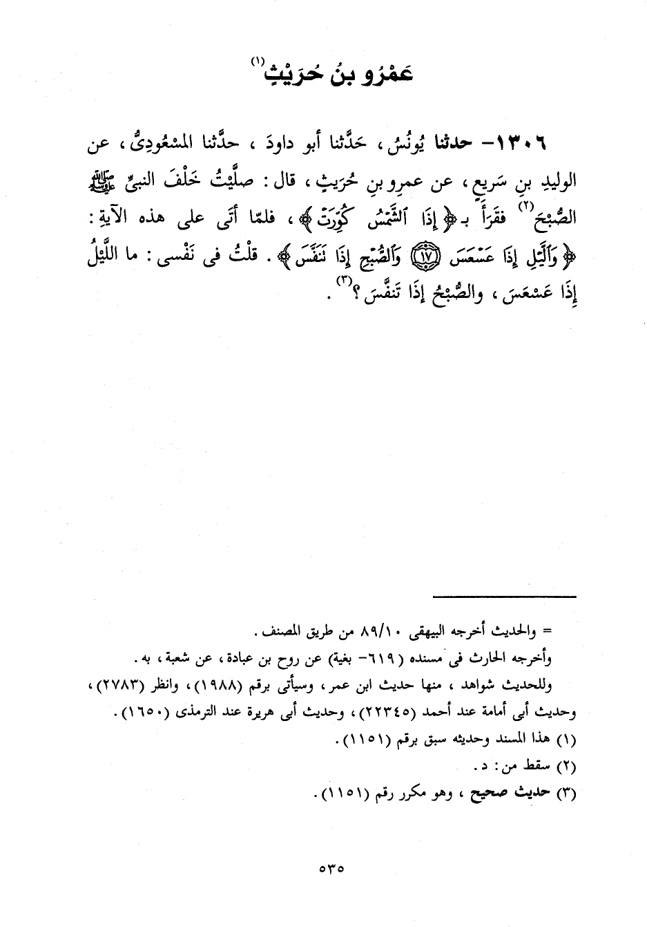 1306 - حَدَّثَنَا يُونُسُ قَالَ: حَدَّثَنَا أَبُو دَاوُدَ قَالَ: حَدَّثَنَا الْمَسْعُودِيُّ، عَنِ الْوَلِيدِ بْنِ سَرِيعٍ، عَنْ عَمْرِو بْنِ حُرَيْثٍ، قَالَ: " §صَلَّيْتُ خَلْفَ النَّبِيِّ صَلَّى اللهُ عَلَيْهِ وَسَلَّمَ الصُّبْحَ فَقَرَأَ بِ إِذَا الشَّمْسُ كُوِّرَتْ فَلَمَّا أَتَى عَلَى هَذِهِ الْآيَةِ {وَاللَّيْلِ إِذَا عَسْعَسَ وَالصُّبْحِ إِذَا تَنَفَّسَ} [التكوير: 18] قُلْتُ فِي نَفْسِي: مَا اللَّيْلُ إِذَا عَسْعَسَ وَالصُّبْحُ إِذَا تَنَفَّسَ؟ "