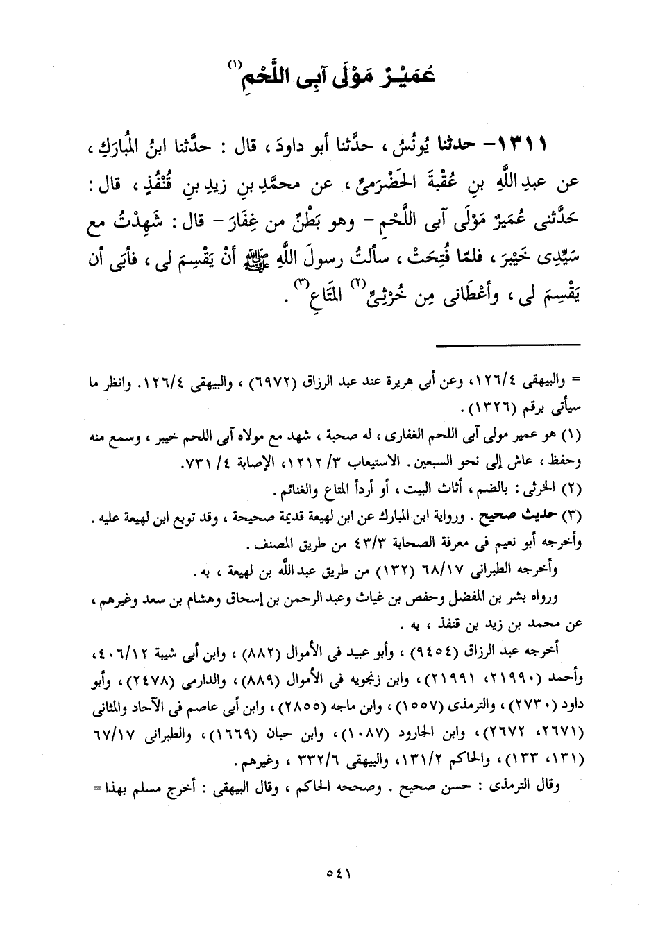 1311 - حَدَّثَنَا يُونُسُ، حَدَّثَنَا أَبُو دَاوُدَ قَالَ: حَدَّثَنَا ابْنُ الْمُبَارَكِ، عَنْ عَبْدِ اللَّهِ بْنِ عُقْبَةَ الْحَضْرَمِيِّ، عَنْ مُحَمَّدِ بْنِ زَيْدِ بْنِ قُنْفُذٍ، قَالَ: حَدَّثَنِي عُمَيْرٌ، مَوْلَى آبِي اللَّحْمِ وَهُوَ بَطْنٌ مِنْ غِفَارَ قَالَ: «شَهِدْتُ مَعَ سَيِّدِي خَيْبَرَ فَلَمَّا فُتِحَتْ سَأَلْتُ رَسُولَ اللَّهِ صَلَّى اللهُ عَلَيْهِ وَسَلَّمَ أَنْ يَقْسِمَ لِي §فَأَبَى أَنْ يَقْسِمَ لِي وَأَعْطَانِي مِنْ خُرْثِيِّ الْمَتَاعِ»