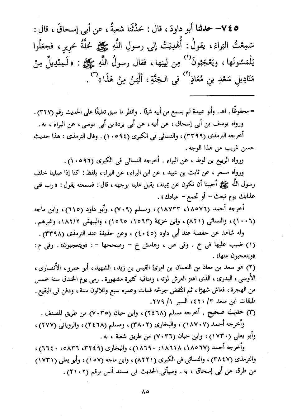 745 - حَدَّثَنَا أَبُو دَاوُدَ قَالَ: حَدَّثَنَا شُعْبَةُ، عَنْ أَبِي إِسْحَاقَ، قَالَ: سَمِعْتُ الْبَرَاءَ، يَقُولُ: أُهْدِيَتْ إِلَى رَسُولِ اللَّهِ صَلَّى اللهُ عَلَيْهِ وَسَلَّمَ حُلَّةُ حَرِيرٍ فَجَعَلُوا يَلْمَسُونَهَا وَيَتَعَجَّبُونَ مِنْ لِينِهَا فَقَالَ رَسُولُ اللَّهِ صَلَّى اللهُ عَلَيْهِ وَسَلَّمَ: «§لَمِنْدِيلٌ مِنْ مَنَادِيلِ سَعْدِ بْنِ مُعَاذٍ فِي الْجَنَّةِ أَلْيَنُ مِنْ هَذَا»