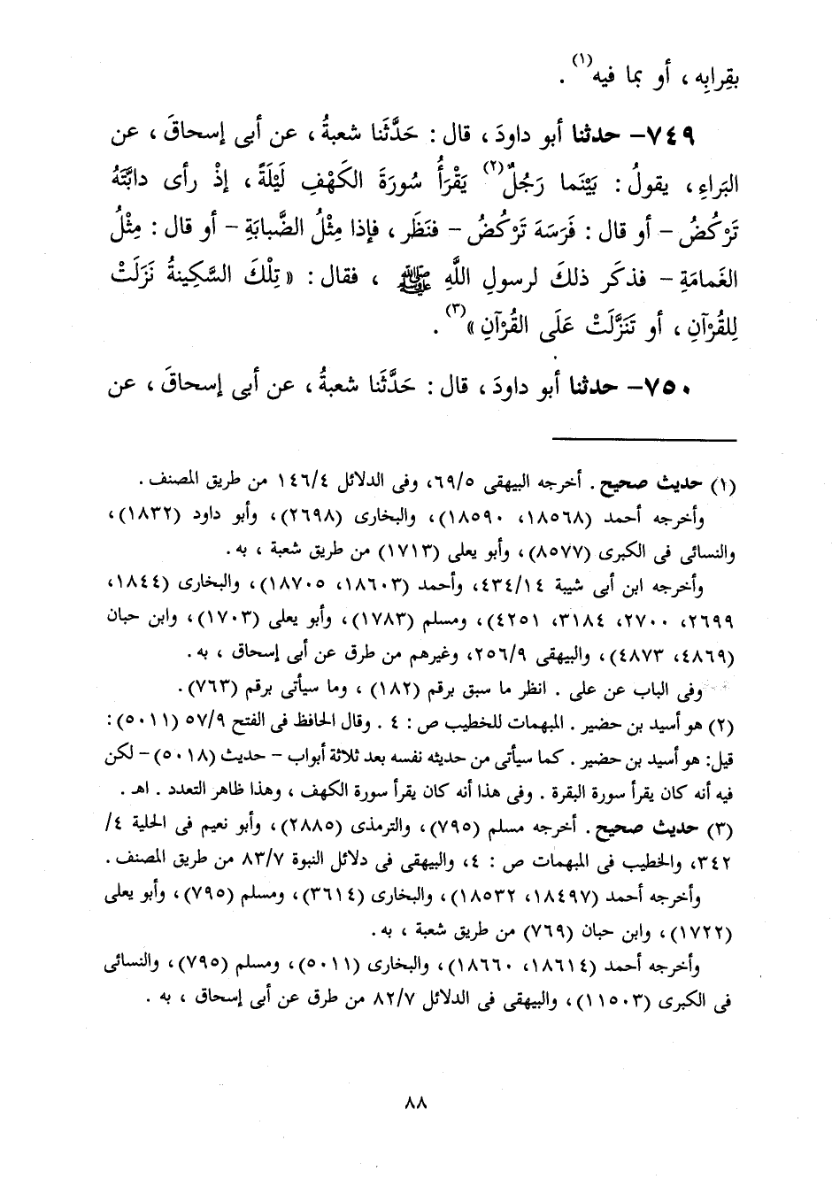 749 - حَدَّثَنَا أَبُو دَاوُدَ قَالَ: حَدَّثَنَا شُعْبَةُ، عَنْ أَبِي إِسْحَاقَ، عَنِ الْبَرَاءِ، يَقُولُ: بَيْنَمَا رَجُلٌ يَقْرَأُ سُورَةَ الْكَهْفِ لَيْلَةً إِذْ رَأَى دَابَّتَهُ تَرْكُضُ - أَوْ قَالَ: فَرَسَهُ تَرْكُضُ - فَنَظَرَ فَإِذَا مِثْلُ الضَّبَابَةِ - أَوْ قَالَ: مِثْلُ الْغَمَامَةِ - فَذَكَرَ ذَلِكَ لِرَسُولِ اللَّهِ صَلَّى اللهُ عَلَيْهِ وَسَلَّمَ فَقَالَ: «§تِلْكَ السَّكِينَةُ نَزَلَتْ لِلْقُرْآنِ أَوْ تَنَزَّلَتْ عَلَى الْقُرْآنِ»