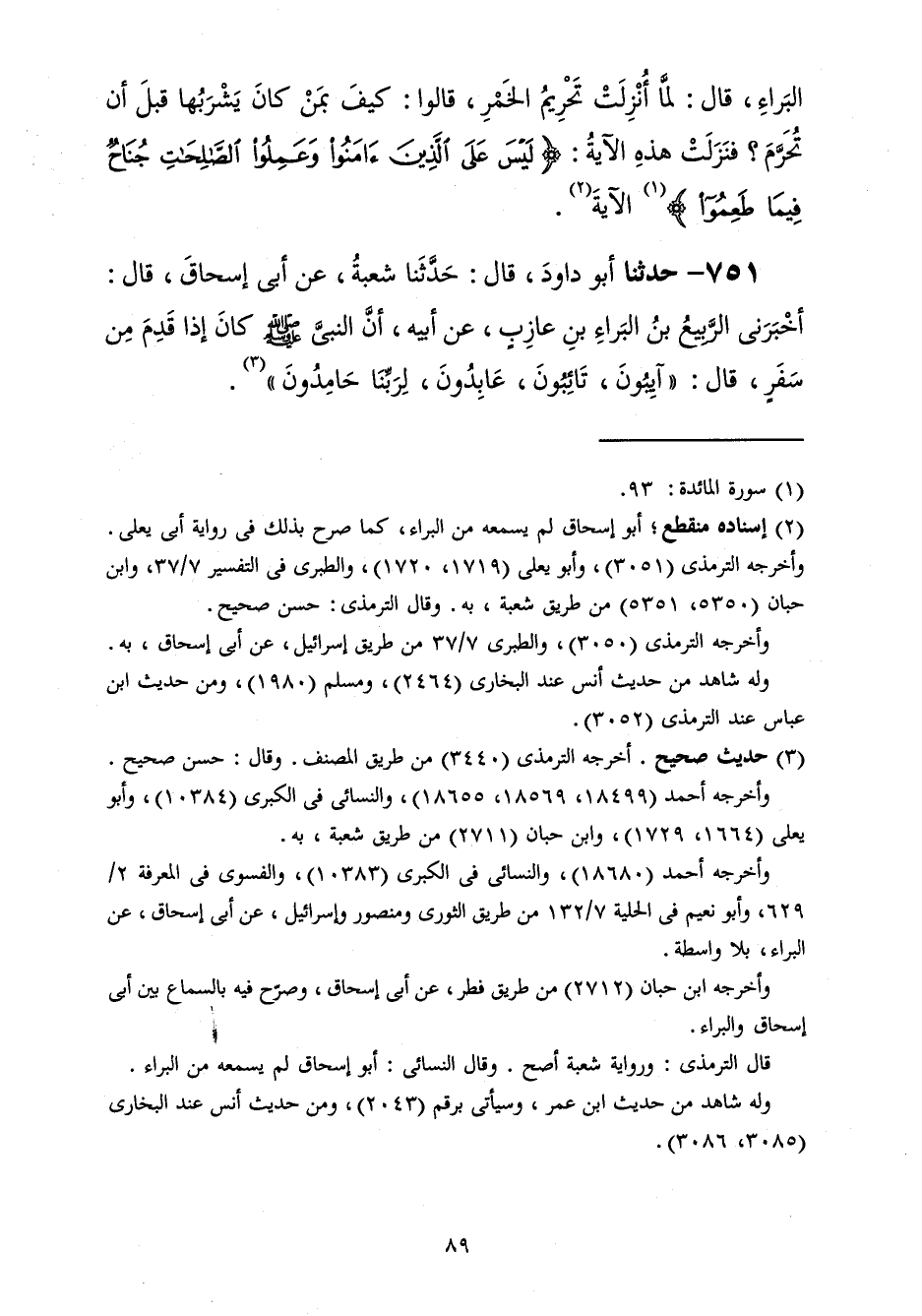 751 - حَدَّثَنَا أَبُو دَاوُدَ قَالَ: حَدَّثَنَا شُعْبَةُ، عَنْ أَبِي إِسْحَاقَ، قَالَ: أَخْبَرَنِي الرَّبِيعُ بْنُ الْبَرَاءِ بْنِ عَازِبٍ، عَنْ أَبِيهِ، أَنَّ النَّبِيَّ صَلَّى اللهُ عَلَيْهِ وَسَلَّمَ كَانَ §إِذَا قَدِمَ مِنْ سَفَرٍ قَالَ: «آيِبُونَ تَائِبُونَ عَابِدُونَ لِرَبِّنَا حَامِدُونَ»