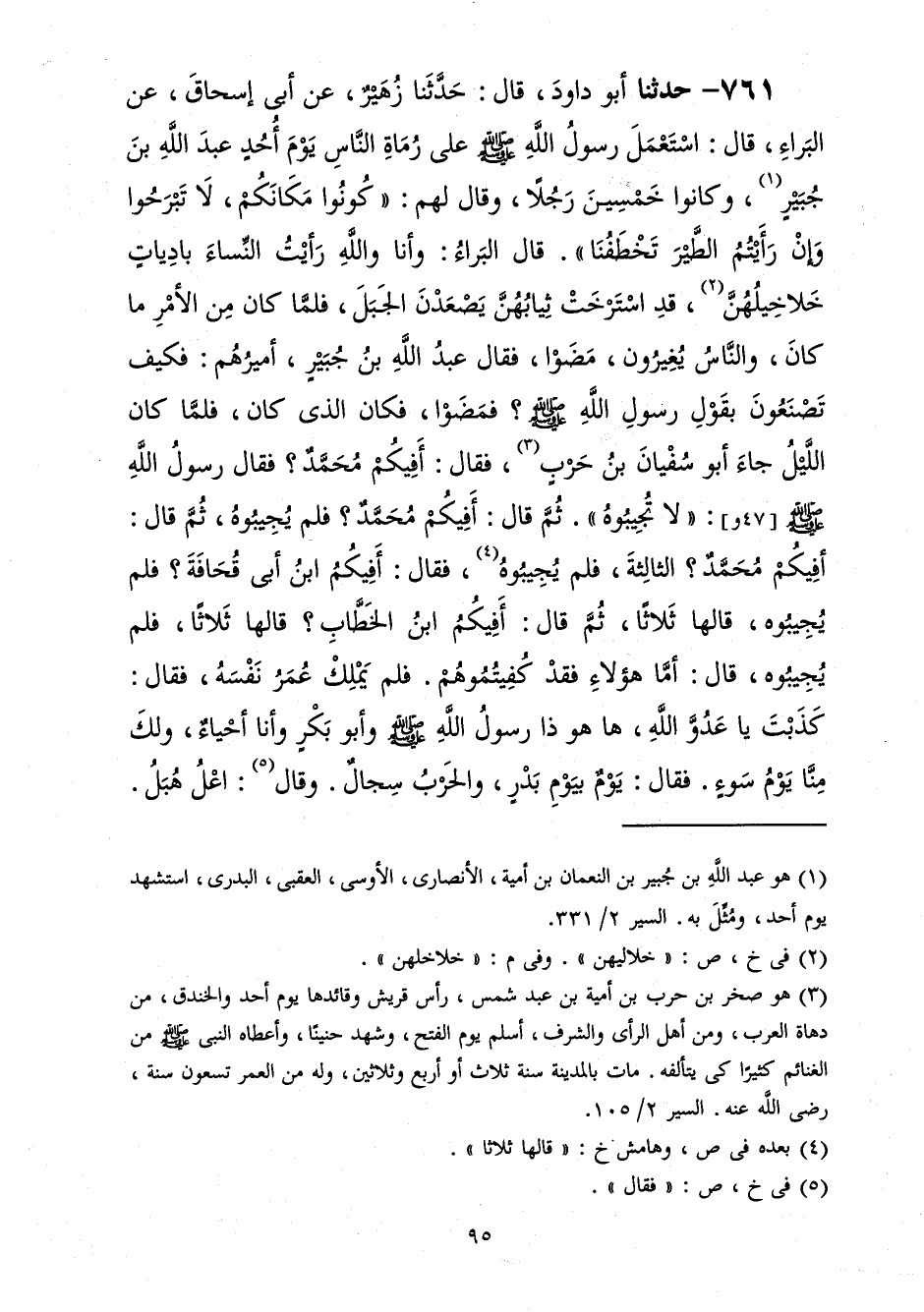 761 - حَدَّثَنَا أَبُو دَاوُدَ قَالَ: حَدَّثَنَا زُهَيْرٌ، عَنْ أَبِي إِسْحَاقَ، عَنِ الْبَرَاءِ، قَالَ: اسْتَعْمَلَ رَسُولُ اللَّهِ صَلَّى اللهُ عَلَيْهِ وَسَلَّمَ عَلَى رُمَاةِ النَّاسِ يَوْمَ أُحُدٍ عَبْدَ اللَّهِ بْنَ جُبَيْرٍ وَكَانُوا خَمْسِينَ رَجُلًا وَقَالَ لَهُمْ: «كُونُوا §مَكَانَكُمْ لَا تَبْرَحُوا وَإِنْ رَأَيْتُمُ الطَّيْرَ تَخْطَفُنَا» قَالَ الْبَرَاءُ: وَأَنَا وَاللَّهِ رَأَيْتُ النِّسَاءَ بَادِيَاتٍ خَلَاخِيلِهِنَّ قَدِ اسْتَرْخَتْ ثِيَابُهُنَّ يَصْعَدْنَ الْجَبَلَ فَلَمَّا كَانَ مِنَ الْأَمْرِ مَا كَانَ وَالنَّاسُ يُغِيرُونَ مَضَوْا فَقَالَ عَبْدُ اللَّهِ بْنُ جُبَيْرٍ أَمِيرُهُمْ: فَكَيْفَ تَصْنَعُونَ بِقَوْلِ رَسُولِ اللَّهِ صَلَّى اللهُ عَلَيْهِ وَسَلَّمَ، فَمَضَوْا فَكَانَ الَّذِي كَانَ فَلَمَّا كَانَ اللَّيْلُ جَاءَ أَبُو سُفْيَانَ بْنُ حَرْبٍ فَقَالَ: أَفِيكُمْ مُحَمَّدٌ؟ فَقَالَ رَسُولُ اللَّهِ صَلَّى اللهُ عَلَيْهِ وَسَلَّمَ: «لَا تُجِيبُوهُ» ثُمَّ قَالَ: أَفِيكُمْ مُحَمَّدٌ؟ فَلَمْ يُجِيبُوهُ ثُمَّ قَالَ: أَفِيكُمْ مُحَمَّدٌ؟ الثَّالِثَةَ فَلَمْ يُجِيبُوهُ فَقَالَ: أَفِيكُمُ ابْنُ أَبِي قُحَافَةَ؟ فَلَمْ يُجِيبُوهُ قَالَهَا ثَلَاثًا ثُمَّ قَالَ: أَفِيكُمُ ابْنُ الْخَطَّابِ؟ قَالَهَا ثَلَاثًا فَلَمْ يُجِيبُوهُ قَالَ: أَمَّا هَؤُلَاءِ فَقَدْ كُفِيتُمُوهُمْ فَلَمْ يَمْلِكْ عُمَرُ نَفْسَهُ فَقَالَ: كَذَبْتَ يَا عَدُوَّ اللَّهِ هَاهُوَ ذَا رَسُولُ اللَّهِ صَلَّى اللهُ عَلَيْهِ وَسَلَّمَ وَأَبُو بَكْرٍ وَأَنَا أَحْيَاءٌ وَلَكَ مِنَّا يَوْمُ سُوءٍ فَقَالَ: يَوْمٌ بِيَوْمِ بَدْرٍ وَالْحَرْبُ سِجَالٌ وَقَالَ: اعْلُ هُبَلُ -[96]- فَقَالَ رَسُولُ اللَّهِ صَلَّى اللهُ عَلَيْهِ وَسَلَّمَ: «أَجِيبُوهُ» قَالُوا: يَا رَسُولَ اللَّهِ، وَمَا نَقُولُ؟ قَالَ: " قُولُوا: اللَّهُ أَعْلَى وَأَجَلُّ " قَالَ: لَنَا الْعُزَّى وَلَا عُزَّى لَكُمْ فَقَالَ رَسُولُ اللَّهِ صَلَّى اللهُ عَلَيْهِ وَسَلَّمَ: «أَجِيبُوهُ» قَالُوا: يَا رَسُولَ اللَّهِ، وَمَا نَقُولُ؟ قَالَ: " قُولُوا: اللَّهُ مَوْلَانَا وَلَا مَوْلَى لَكُمْ " ثُمَّ قَالَ أَبُو سُفْيَانَ: إِنَّكُمْ سَتَرَوْنَ فِي الْقَوْمِ مُثْلَةً لَمْ آمُرْ بِهَا ثُمَّ قَالَ: وَلَمْ تَسُؤْنِي