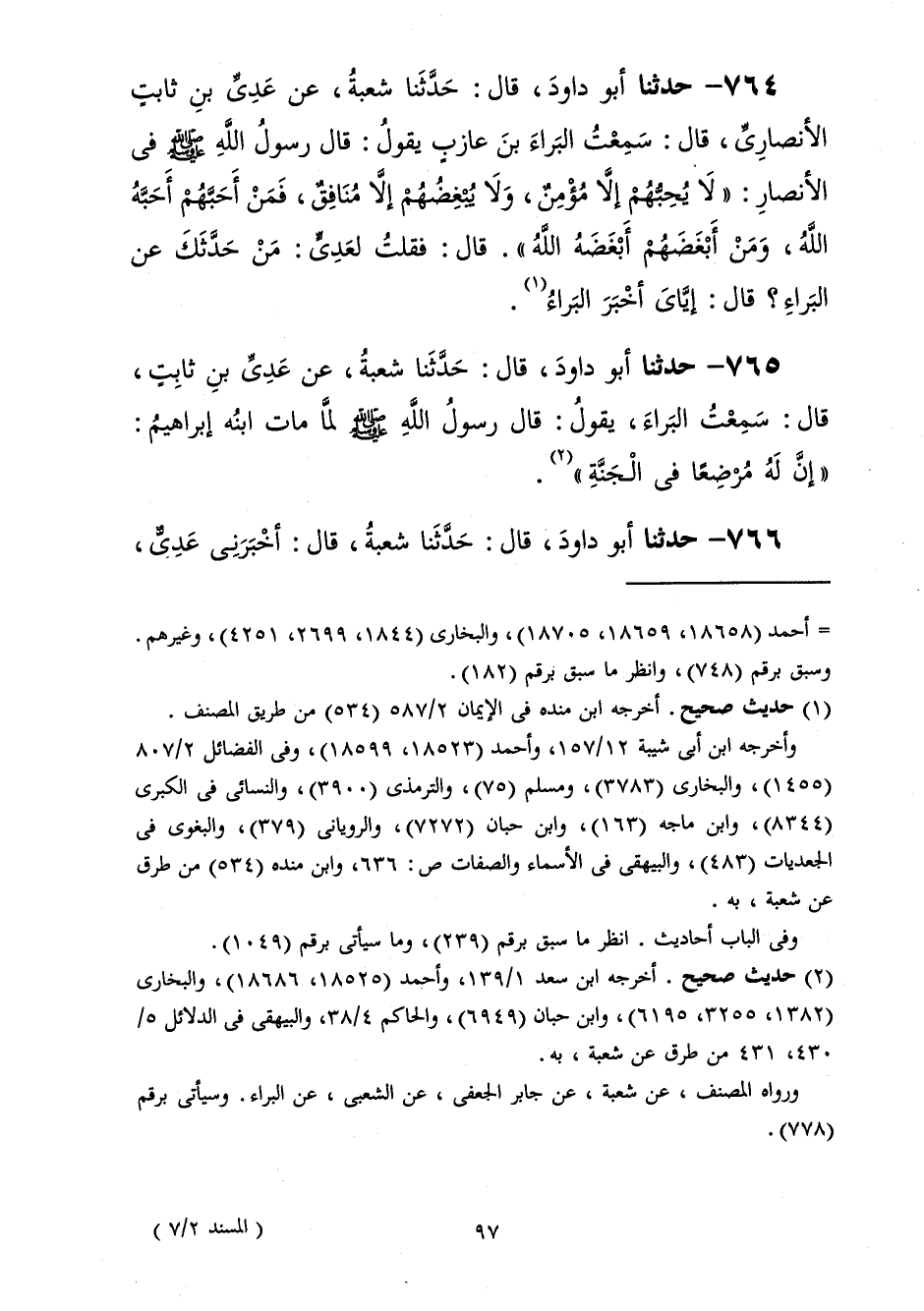 764 - حَدَّثَنَا أَبُو دَاوُدَ قَالَ: حَدَّثَنَا شُعْبَةُ، عَنْ عَدِيِّ بْنِ ثَابِتٍ الْأَنْصَارِيِّ، قَالَ: سَمِعْتُ الْبَرَاءَ بْنَ عَازِبٍ، يَقُولُ: قَالَ رَسُولُ اللَّهِ صَلَّى اللهُ عَلَيْهِ وَسَلَّمَ فِي الْأَنْصَارِ: «§لَا يُحِبُّهُمْ إِلَّا مُؤْمِنٌ وَلَا يُبْغِضُهُمْ إِلَّا مُنَافِقٌ، فَمَنْ أَحَبَّهُمْ أَحَبَّهُ اللَّهُ وَمَنْ أَبْغَضَهُمْ أَبْغَضَهُ اللَّهُ» قَالَ: فَقُلْتُ لِعَدِيٍّ: مَنْ حَدَّثَكَ عَنِ الْبَرَاءِ؟ قَالَ: إِيَّايَ أَخْبَرَ الْبَرَاءُ