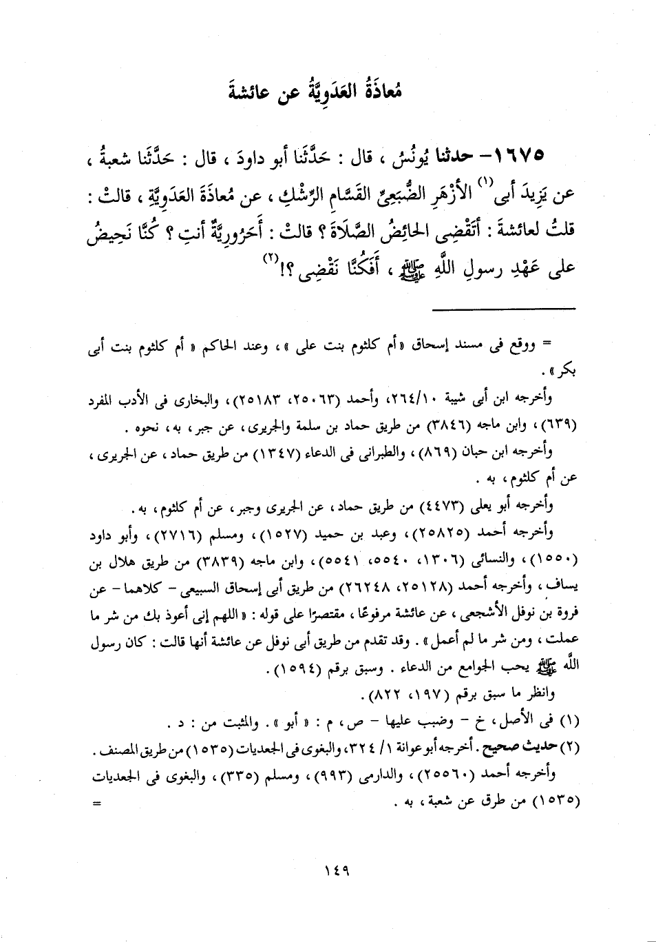 1675 - حَدَّثَنَا يُونُسُ قَالَ: حَدَّثَنَا أَبُو دَاوُدَ قَالَ: حَدَّثَنَا شُعْبَةُ، عَنْ يَزِيدَ أَبِي الْأَزْهَرِ الضُّبَعِيِّ الْقَسَّامِ الرِّشْكِ، عَنْ مُعَاذَةَ الْعَدَوِيَّةِ، قَالَتْ: قُلْتُ لِعَائِشَةَ: §أَتَقْضِي الْحَائِضُ الصَّلَاةَ؟ قَالَتْ: «أَحَرُورِيَّةٌ أَنْتِ؟ كُنَّا نَحِيضُ عَلَى عَهْدِ رَسُولِ اللَّهِ صَلَّى اللهُ عَلَيْهِ وَسَلَّمَ أَفَكُنَّا نَقْضِي؟»