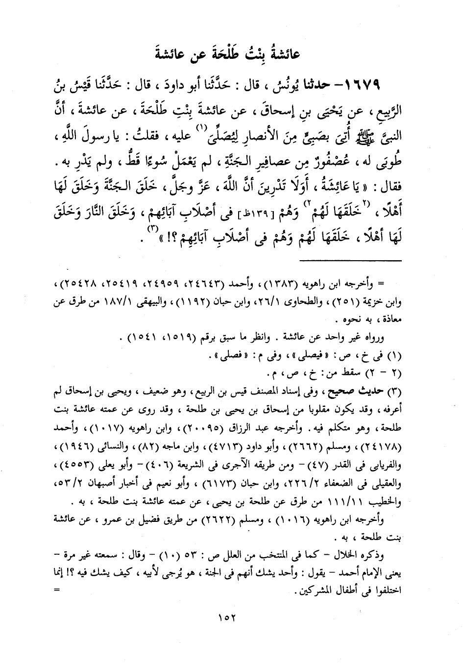 1679 - حَدَّثَنَا يُونُسُ قَالَ: حَدَّثَنَا أَبُو دَاوُدَ قَالَ: حَدَّثَنَا قَيْسُ بْنُ الرَّبِيعِ، عَنْ يَحْيَى بْنِ إِسْحَاقَ، عَنْ عَائِشَةَ بِنْتِ طَلْحَةَ، عَنْ عَائِشَةَ، أَنَّ النَّبِيَّ صَلَّى اللهُ عَلَيْهِ وَسَلَّمَ أُتِيَ بِصَبِيٍّ مِنَ الْأَنْصَارِ لِيُصَلَّى عَلَيْهِ، فَقُلْتُ: يَا رَسُولَ اللَّهِ طُوبَى لَهُ، عُصْفُورٌ مِنْ عَصَافِيرِ الْجَنَّةِ، لَمْ يَعْمَلْ سُوءًا قَطُّ، وَلَمْ يَدْرِ بِهِ، فَقَالَ: «يَا عَائِشَةُ أَوَلَا تَدْرِينَ أَنَّ اللَّهَ عَزَّ وَجَلَّ §خَلَقَ الْجَنَّةَ، وَخَلَقَ لَهَا أَهْلًا خَلَقَهَا لَهُمْ وَهُمْ فِي أَصْلَابِ آبَائِهِمْ، وَخَلَقَ النَّارَ، وَخَلَقَ لَهَا أَهْلًا، خَلَقَهَا لَهُمْ وَهُمْ فِي أَصْلَابِ آبَائِهِمْ»