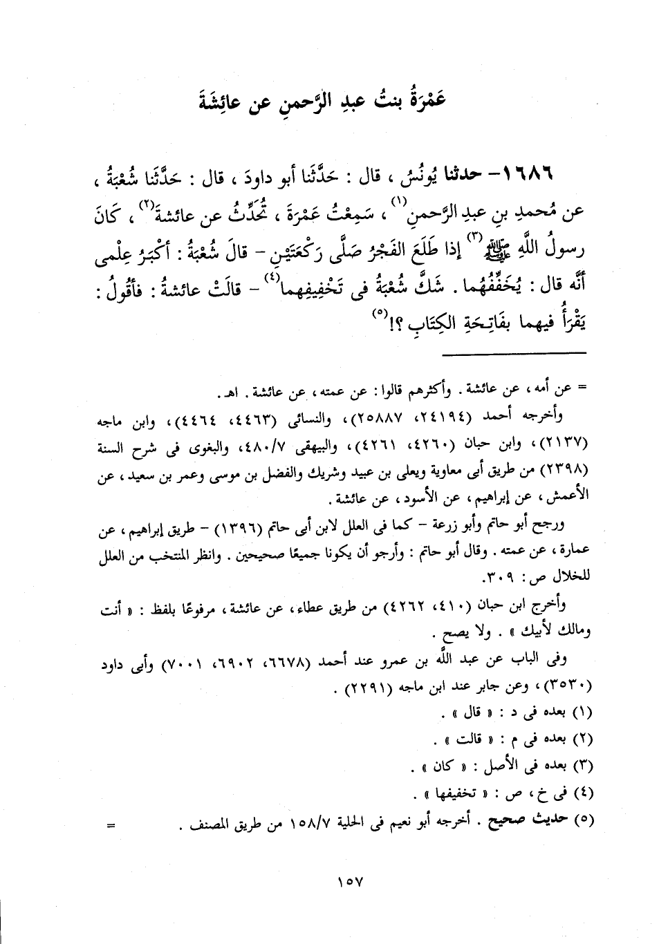 1686 - حَدَّثَنَا يُونُسُ قَالَ: حَدَّثَنَا أَبُو دَاوُدَ قَالَ: حَدَّثَنَا شُعْبَةُ، عَنْ مُحَمَّدِ بْنِ عَبْدِ الرَّحْمَنِ، سَمِعْتُ عَمْرَةَ، تُحَدِّثُ عَنْ عَائِشَةَ، كَانَ رَسُولُ اللَّهِ صَلَّى اللهُ عَلَيْهِ وَسَلَّمَ §إِذَا طَلَعَ الْفَجْرُ صَلَّى رَكْعَتَيْنِ " قَالَ شُعْبَةُ: أَكْبَرُ عِلْمِي أَنَّهُ قَالَ: «يُخَفِّفُهُمَا» شَكَّ شُعْبَةُ فِي تَخْفِيفِهِمَا قَالَتْ عَائِشَةُ: «فَأَقُولُ يَقْرَأُ فِيهِمَا بِفَاتِحَةِ الْكِتَابِ»