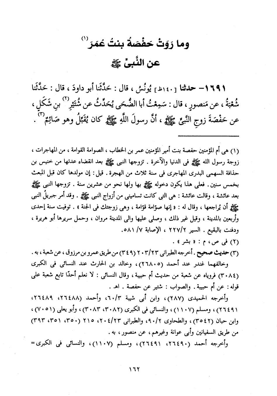 1691 - حَدَّثَنَا يُونُسُ قَالَ: حَدَّثَنَا أَبُو دَاوُدَ قَالَ: حَدَّثَنَا شُعْبَةُ، عَنْ مَنْصُورٍ، قَالَ: سَمِعْتُ أَبَا الضُّحَى، يُحَدِّثُ عَنْ شُتَيْرِ بْنِ شَكَلٍ، عَنْ حَفْصَةَ، زَوْجِ النَّبِيِّ صَلَّى اللهُ عَلَيْهِ وَسَلَّمَ، أَنَّ رَسُولَ اللَّهِ صَلَّى اللهُ عَلَيْهِ وَسَلَّمَ «كَانَ §يُقَبِّلُ وَهُوَ صَائِمٌ»