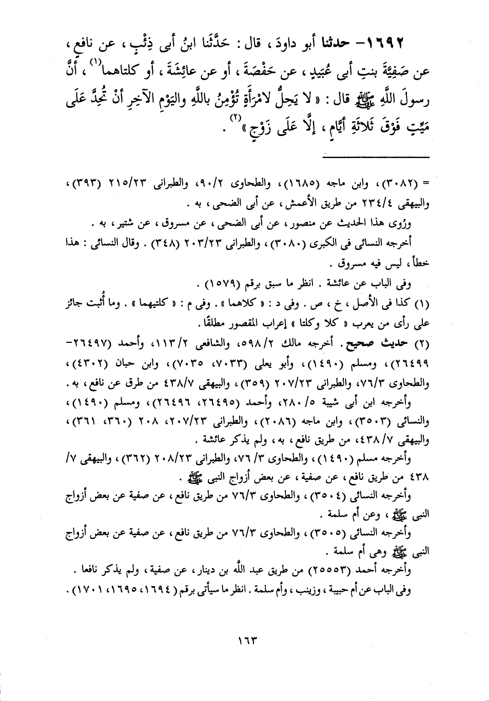 1692 - حَدَّثَنَا أَبُو دَاوُدَ قَالَ: حَدَّثَنَا ابْنُ أَبِي ذِئْبٍ، عَنْ نَافِعٍ، عَنْ صَفِيَّةَ بِنْتِ أَبِي عُبَيْدٍ، عَنْ حَفْصَةَ، أَوْ عَنْ عَائِشَةَ، أَوْ كِلْتَاهُمَا، أَنَّ رَسُولَ اللَّهِ صَلَّى اللهُ عَلَيْهِ وَسَلَّمَ قَالَ: «§لَا يَحِلُّ لِامْرَأَةٍ تُؤْمِنُ بِاللَّهِ وَالْيَوْمِ الْآخِرِ أَنْ تُحِدَّ عَلَى مَيِّتٍ فَوْقَ ثَلَاثَةِ إِلَّا عَلَى زَوْجٍ»