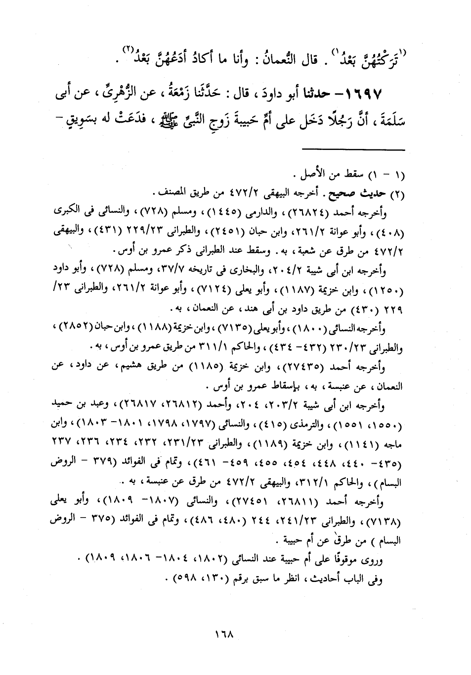 1697 - حَدَّثَنَا أَبُو دَاوُدَ قَالَ: حَدَّثَنَا زَمْعَةُ، عَنِ الزُّهْرِيِّ، عَنْ أَبِي سَلَمَةَ، أَنَّ رَجُلًا دَخَلَ عَلَى أُمِّ حَبِيبَةَ زَوْجِ النَّبِيِّ صَلَّى اللهُ عَلَيْهِ وَسَلَّمَ فَدَعَتْ لَهُ بِسَوِيقٍ -[169]- أَوْ بِطَعَامٍ، ثُمَّ قَالَتْ لَهُ: يَا ابْنَ أَخِ تَوَضَّأْ فَإِنِّي سَمِعْتُ رَسُولَ اللَّهِ صَلَّى اللهُ عَلَيْهِ وَسَلَّمَ يَقُولُ: «§الْوُضُوءُ مِمَّا غَيَّرَتِ النَّارُ» أَوْ قَالَ «مِمَّا مَسَّتِ النَّارُ»