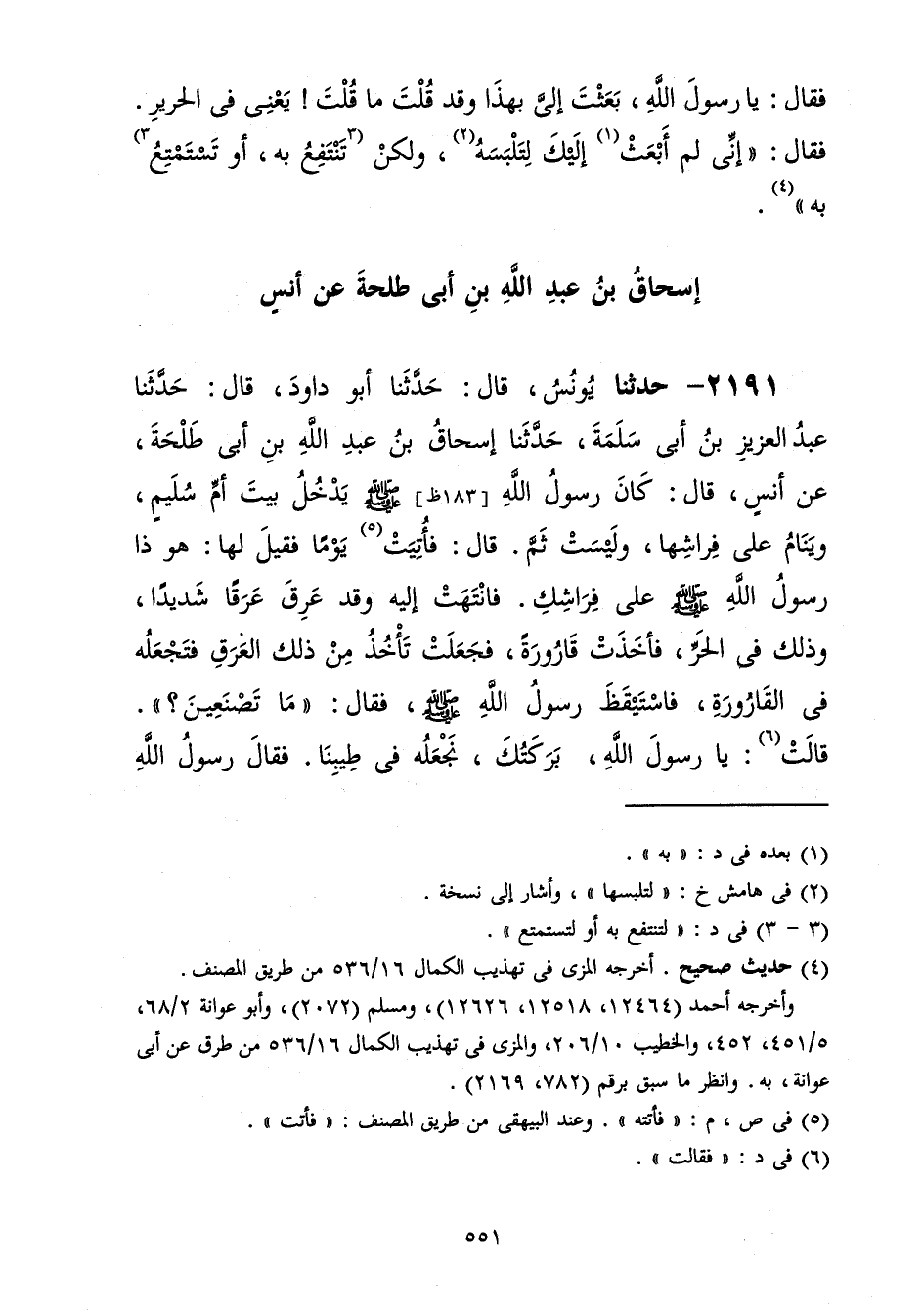 2191 - حَدَّثَنَا يُونُسُ، حَدَّثَنَا أَبُو دَاوُدَ قَالَ: حَدَّثَنَا عَبْدُ الْعَزِيزِ بْنُ أَبِي سَلَمَةَ، حَدَّثَنَا إِسْحَاقُ بْنُ عَبْدِ اللَّهِ بْنِ أَبِي طَلْحَةَ، عَنْ أَنَسٍ، قَالَ: " كَانَ رَسُولُ اللَّهِ صَلَّى اللهُ عَلَيْهِ وَسَلَّمَ يَدْخُلُ بَيْتَ أُمِّ سُلَيْمٍ وَيَنَامُ عَلَى فِرَاشِهَا، وَلَيْسَتْ ثَمَّ، قَالَ: فَأُتِيَتْ يَوْمًا، فَقِيلَ لَهَا: هُوَ ذَا رَسُولُ اللَّهِ صَلَّى اللهُ عَلَيْهِ وَسَلَّمَ عَلَى فِرَاشِكِ، فَانْتَهَتْ إِلَيْهِ وَقَدْ عَرِقَ عَرَقًا شَدِيدًا، وَذَلِكَ فِي الْحَرِّ، فَأَخَذَتْ قَارُورَةً §فَجَعَلَتْ تَأْخُذُ مِنَ ذَلِكَ الْعَرَقِ فَتَجْعَلُهُ فِي الْقَارُورَةِ، فَاسْتَيْقَظَ رَسُولُ اللَّهِ صَلَّى اللهُ عَلَيْهِ وَسَلَّمَ فَقَالَ: «مَا تَصْنَعِينَ؟» قَالَتْ: يَا رَسُولَ اللَّهِ بَرَكَتُكَ، نَجْعَلُهُ فِي طِيبِنَا، فَقَالَ رَسُولُ اللَّهِ صَلَّى اللهُ عَلَيْهِ وَسَلَّمَ -[552]-: «أَصَبْتِ»