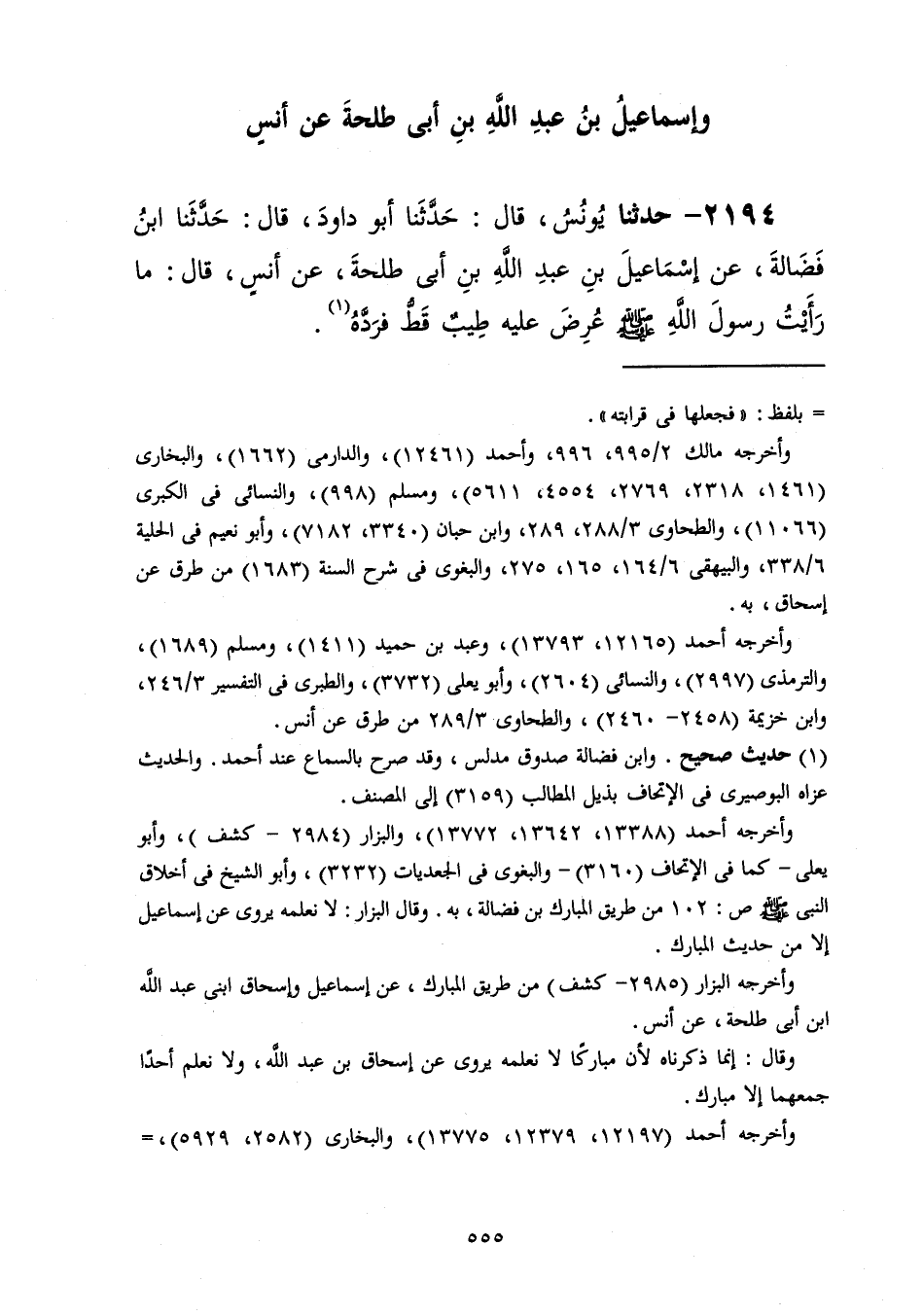 2194 - حَدَّثَنَا يُونُسُ، حَدَّثَنَا أَبُو دَاوُدَ قَالَ: حَدَّثَنَا ابْنُ فَضَالَةَ، عَنْ إِسْمَاعِيلَ بْنِ عَبْدِ اللَّهِ بْنِ أَبِي طَلْحَةَ، عَنْ أَنَسٍ، قَالَ: «§مَا رَأَيْتُ رَسُولَ اللَّهِ صَلَّى اللهُ عَلَيْهِ وَسَلَّمَ عُرِضَ عَلَيْهِ طِيبٌ قَطُّ فَرَدَّهُ»