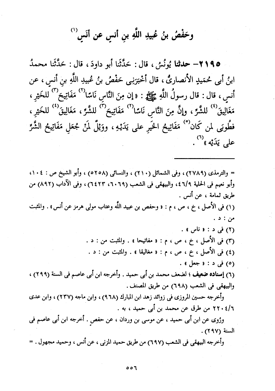 2195 - حَدَّثَنَا يُونُسُ، حَدَّثَنَا أَبُو دَاوُدَ قَالَ: حَدَّثَنَا مُحَمَّدُ بْنُ أَبِي حُمَيْدٍ الْأَنْصَارِيُّ، قَالَ: أَخْبَرَنِي حَفْصُ بْنُ عُبَيْدِ اللَّهِ بْنِ أَنَسٍ، عَنْ أَنَسٍ، قَالَ: قَالَ رَسُولُ اللَّهِ صَلَّى اللهُ عَلَيْهِ وَسَلَّمَ: «إِنَّ §مِنَ النَّاسِ نَاسًا مَفَاتِيحَ لِلْخَيْرِ مَغَالِيقَ لِلشَّرِّ، وَإِنَّ مِنَ النَّاسِ نَاسًا مَفَاتِيحَ لِلشَّرِّ مَغَالِيقَ لِلْخَيْرِ، فَطُوبَى لِمَنْ كَانَ مَفَاتِيحُ الْخَيْرِ عَلَى يَدَيْهِ، وَوَيْلٌ لِمَنْ جُعِلَ مَفَاتِيحُ الشَّرِّ عَلَى يَدَيْهِ»