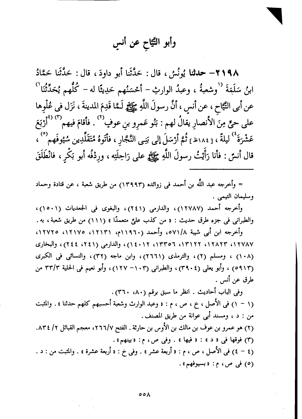 2198 - حَدَّثَنَا يُونُسُ قَالَ: حَدَّثَنَا أَبُو دَاوُدَ قَالَ: حَدَّثَنَا حَمَّادُ بْنُ سَلَمَةَ، وَشُعْبَةُ، وَعَبْدُ الْوَارِثِ، أَحْسَنُهُمْ حَدِيثًا لَهُ كُلُّهُمْ يُحَدِّثُنَا عَنْ أَبِي التَّيَّاحِ، عَنْ أَنَسٍ، أَنَّ رَسُولَ اللَّهِ صَلَّى اللهُ عَلَيْهِ وَسَلَّمَ لَمَّا قَدِمَ الْمَدِينَةَ نَزَلَ فِي عُلْوِهَا عَلَى حَيٍّ مِنَ الْأَنْصَارِ يُقَالُ لَهُمْ بَنُو عَمْرِو بْنِ عَوْفٍ فَأَقَامَ فِيهِمْ أَرْبَعَ عَشْرَةَ لَيْلَةً، ثُمَّ أَرْسَلَ إِلَى بَنِي النَّجَّارِ، فَأَتَوْهُ مُتَقَلِّدِينَ سُيُوفَهُمْ، قَالَ أَنَسٌ: فَأَنَا رَأَيْتُ رَسُولَ اللَّهِ صَلَّى اللهُ عَلَيْهِ وَسَلَّمَ عَلَى رَاحِلَتِهِ، وَرِدْفُهُ أَبُو بَكْرٍ، فَانْطَلَقَ -[559]- حَتَّى نَزَلَ بِفِنَاءِ أَبِي أَيُّوبَ الْأَنْصَارِيِّ، فَقَالَ: «يَا بَنِي النَّجَّارِ، §ثَامِنُونِي بِحَائِطِكُمْ» قَالُوا: لَا، وَاللَّهِ لَا نَأْخُذُ لَهُ ثَمَنًا إِلَّا مِنَ اللَّهِ وَمِنْ رَسُولِهِ، أَوْ قَالَ: لَا نَأَحُذُ لَهُ ثَمَنًا إِلَّا اللَّهَ وَرَسُولَهُ، قَالَ: وَكَانَ رَسُولُ اللَّهِ صَلَّى اللهُ عَلَيْهِ وَسَلَّمَ يُصَلِّي حَيْثُ أَدْرَكَتْهُ الصَّلَاةُ، وَيُصَلِّي فِي مَرَابِضِ الْغَنَمِ، قَالَ أَنَسٌ: وَكَانَ فِيهِ مَا أَقُولُ لَكُمْ، كَانَ فِيهِ نَخْلٌ، قَالَ حَمَّادٌ: وَقَالَ عَبْدُ الْوَارِثِ: خِرَبٌ وَقُبُورُ الْمُشْرِكِينَ، فَأَمَرَ بِالنَّخْلِ فَقُطِعَ، وَأَمَرَ بِقُبُورِ الْمُشْرِكِينَ فَنُبِشَتْ، وَأَمَرَ بِالِْخِرَبِ فَسُوِّيَتْ، فَجَعَلَ النَّخْلَ قِبْلَةَ الْمَسْجِدِ، فَجَعَلُوا يَنْقُلُونَ الصَّخْرَ وَيَرْتَجِزُونَ، وَرَسُولُ اللَّهِ صَلَّى اللهُ عَلَيْهِ وَسَلَّمَ مَعَهُمْ، فَجَعَلُوا يَقُولُونَ: أَوْ قَالَ: