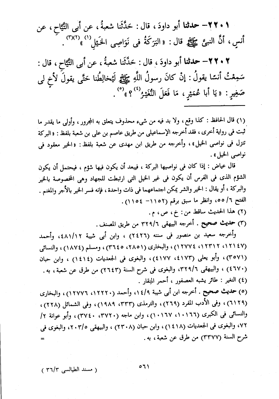 2201 - حَدَّثَنَا أَبُو دَاوُدَ قَالَ: حَدَّثَنَا شُعْبَةُ، عَنْ أَبِي التَّيَّاحِ، عَنْ أَنَسٍ، أَنَّ النَّبِيَّ صَلَّى اللهُ عَلَيْهِ وَسَلَّمَ قَالَ: «§الْبَرَكَةُ فِي نَوَاصِي الْخَيْلِ»